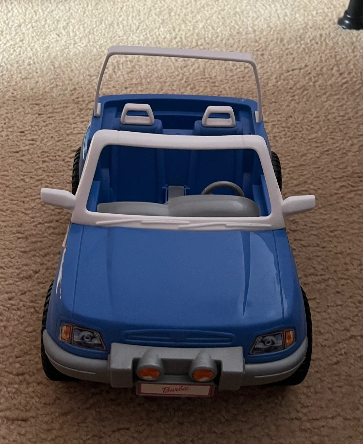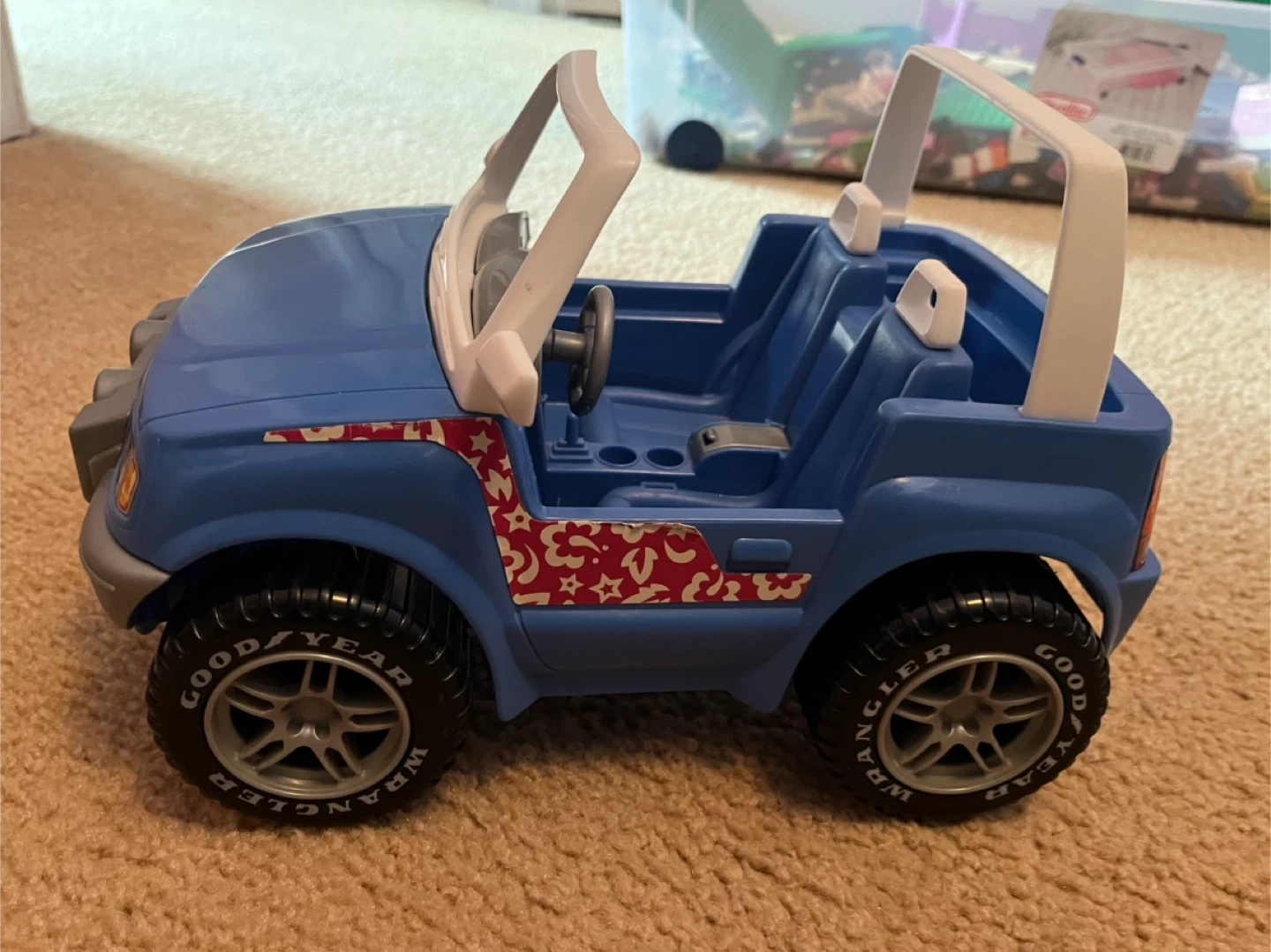 Selling a cute blue Barbie Jeep Wrangler toy car! It's in great shape and ready for a new home. Perfect for any Barbie enthusiast or young child who loves playing with cars. It features a fun design with a white roll bar and grey interior. The tires are marked with "Goodyear Wrangler".