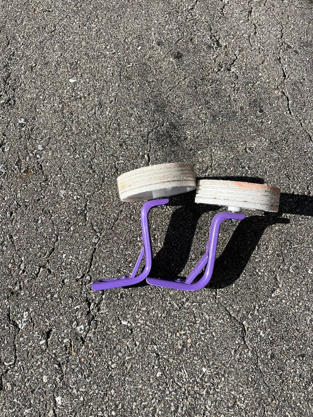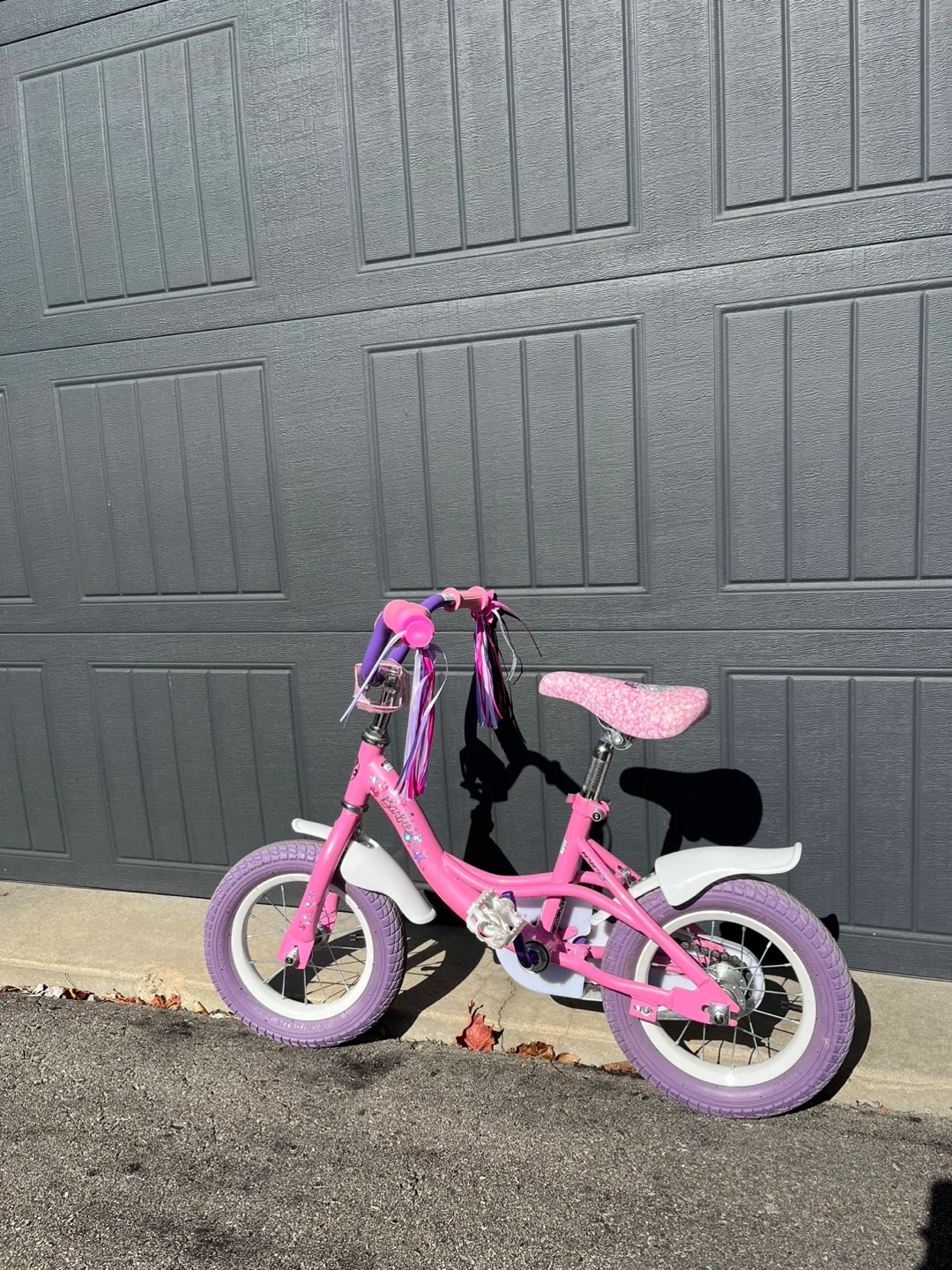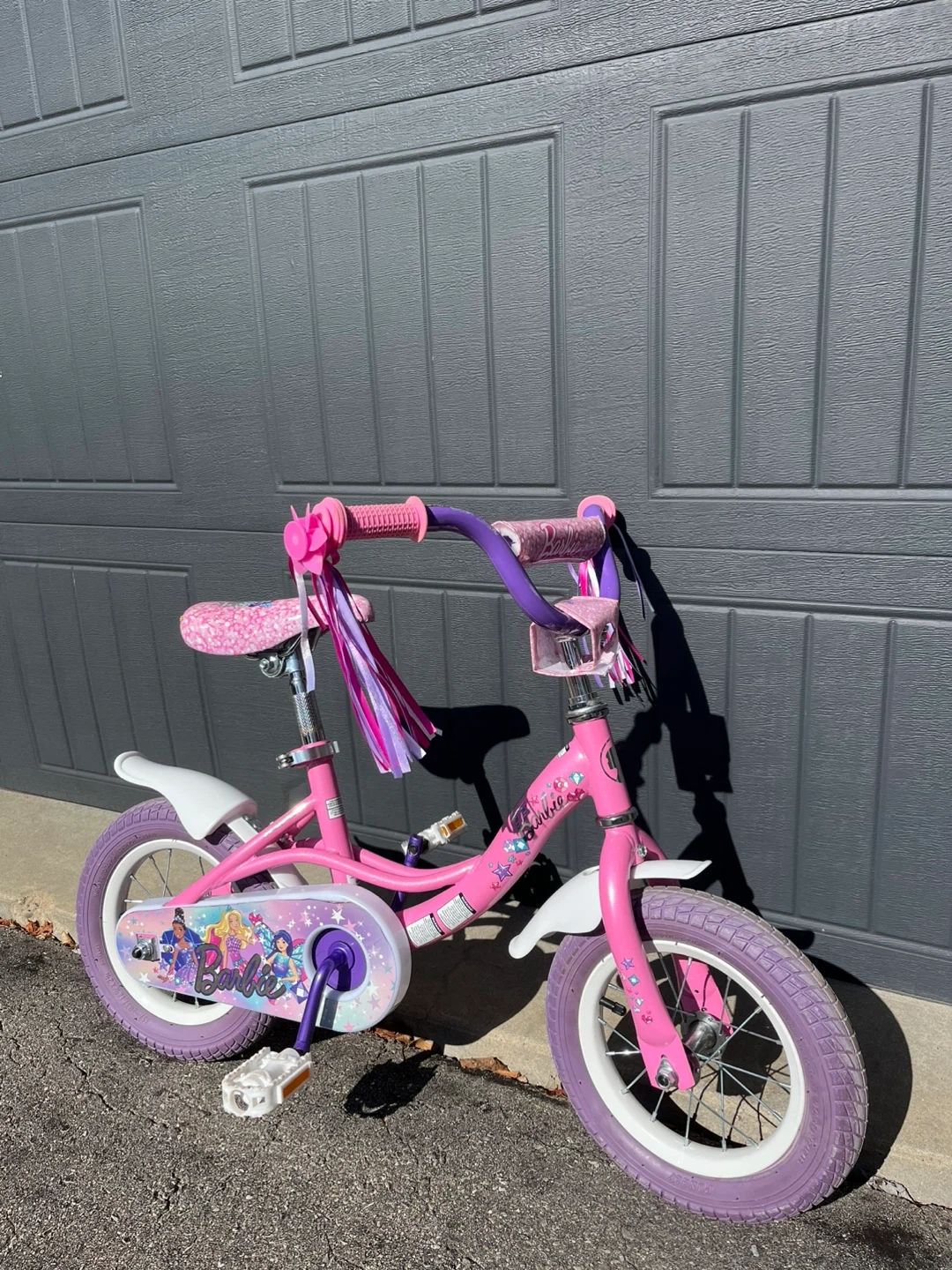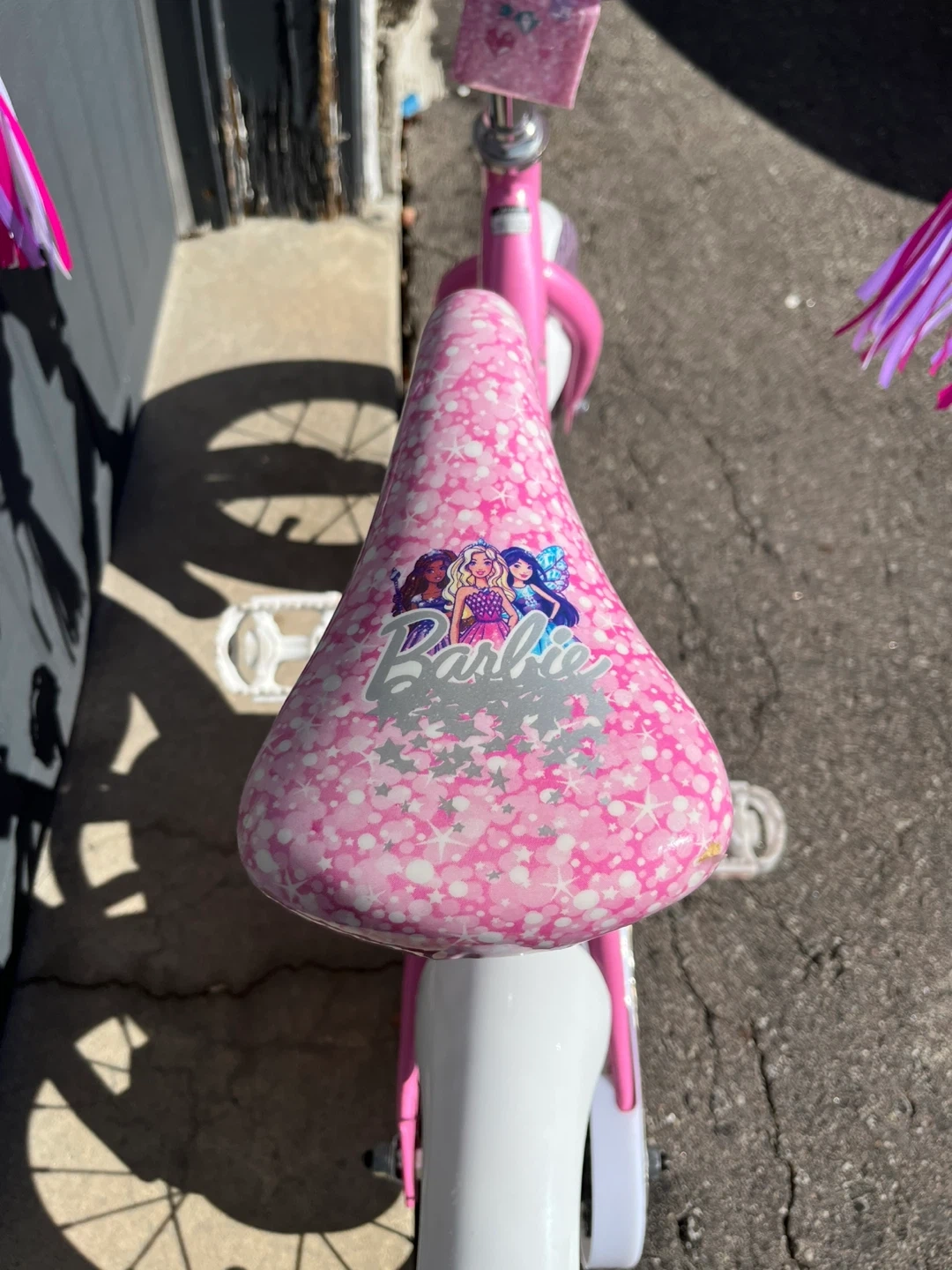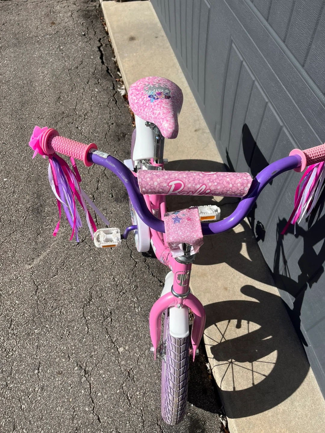 This is a cute Barbie themed kids' bike! It's pink and purple and has Barbie graphics on the seat and frame. Perfect for a little one learning to ride.