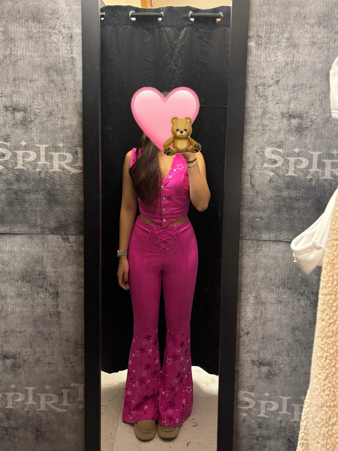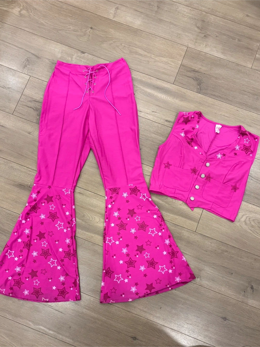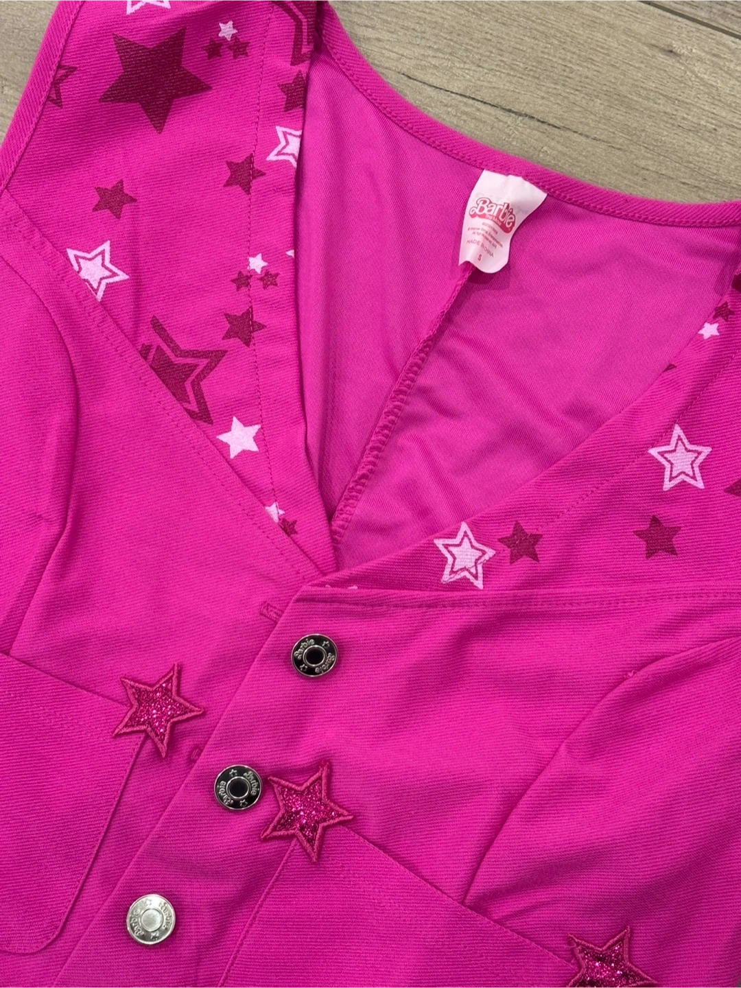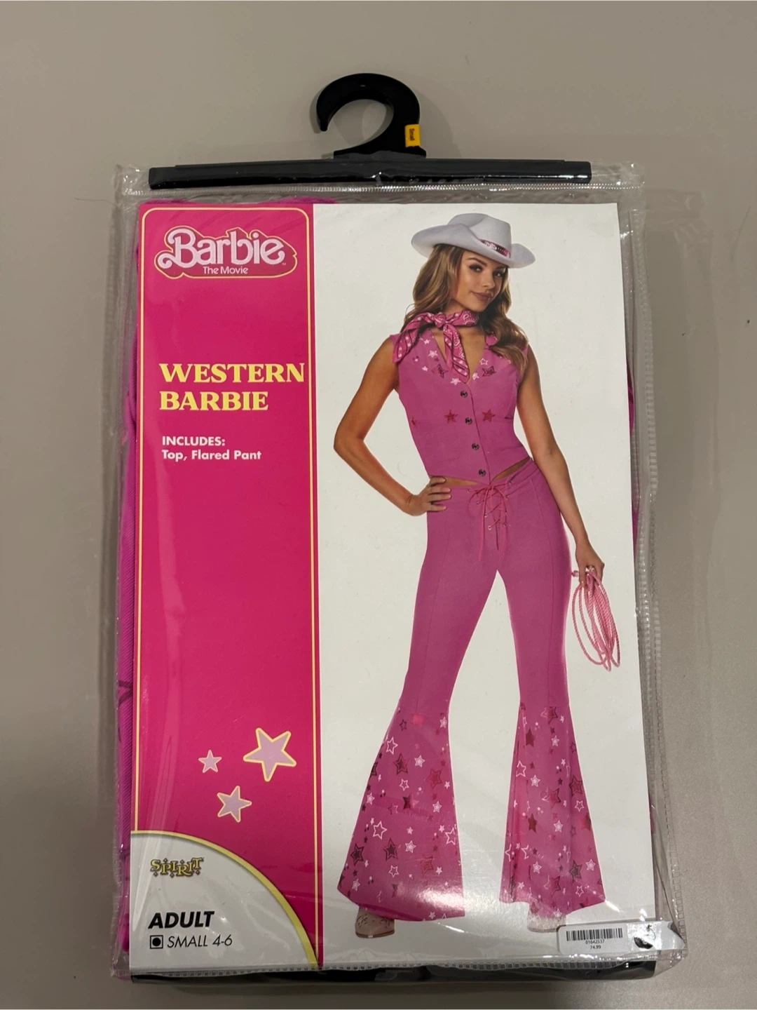 Yeehaw! Get ready to channel your inner Barbie with this Western Barbie costume from the new movie! This set includes a top and flared pants, both in a vibrant pink with star details. It's an adult size small . Originally priced at $74.99, this costume is perfect for Halloween, cosplay, or any Barbie-themed event Worn once, freshly washed — super comfy with good stretch! Got it from Spirit Halloween last year🩷