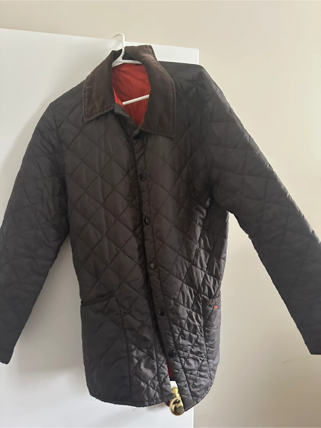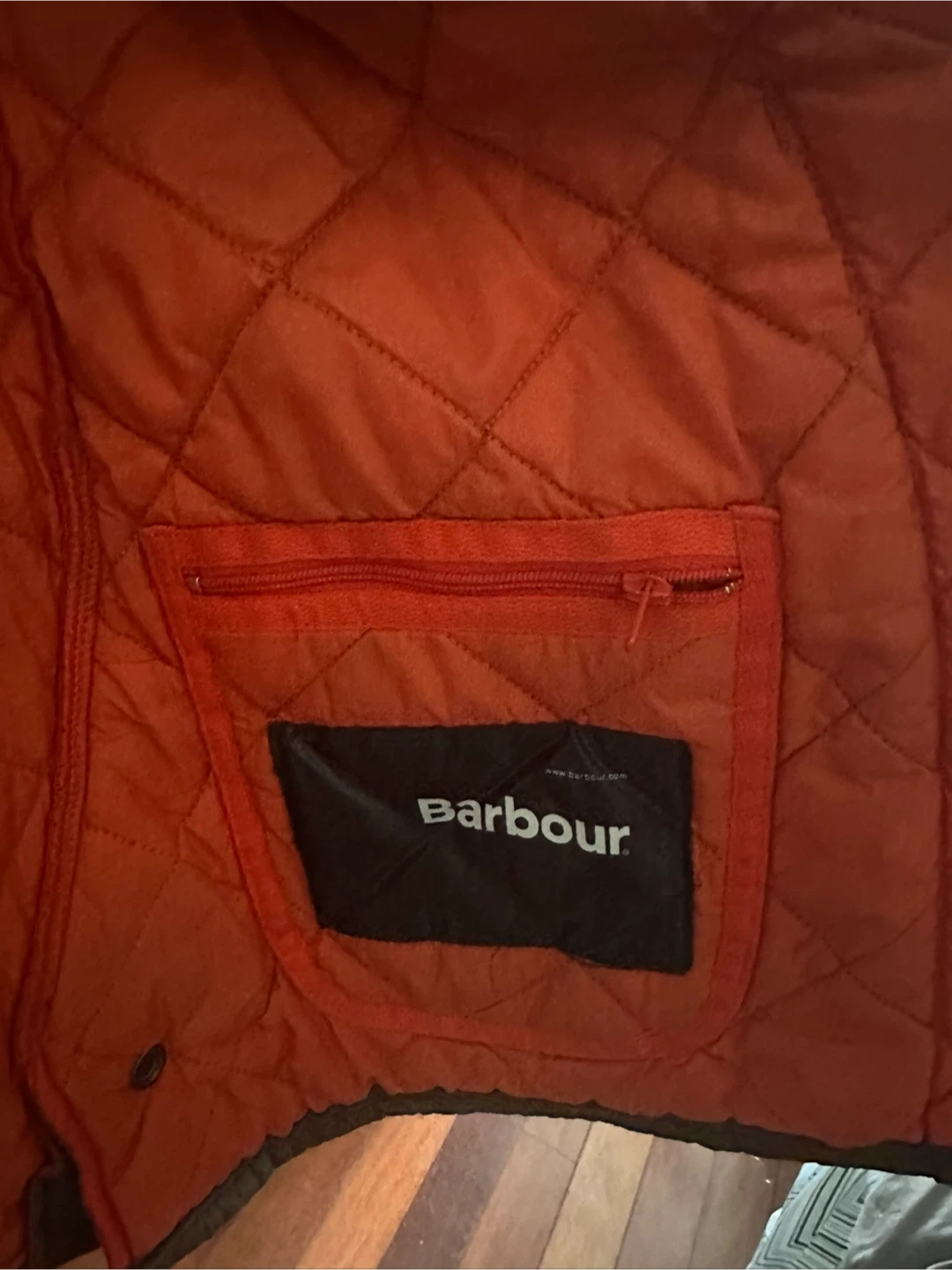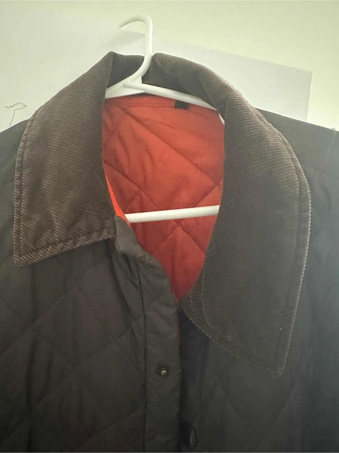 60Classic brown Barbour quilted jacket with a corduroy collar. It's in great condition and ready for a new home! The inside is lined with a vibrant orange quilted fabric. Perfect for adding a touch of British style to your wardrobe. Around mid-thigh in length.
