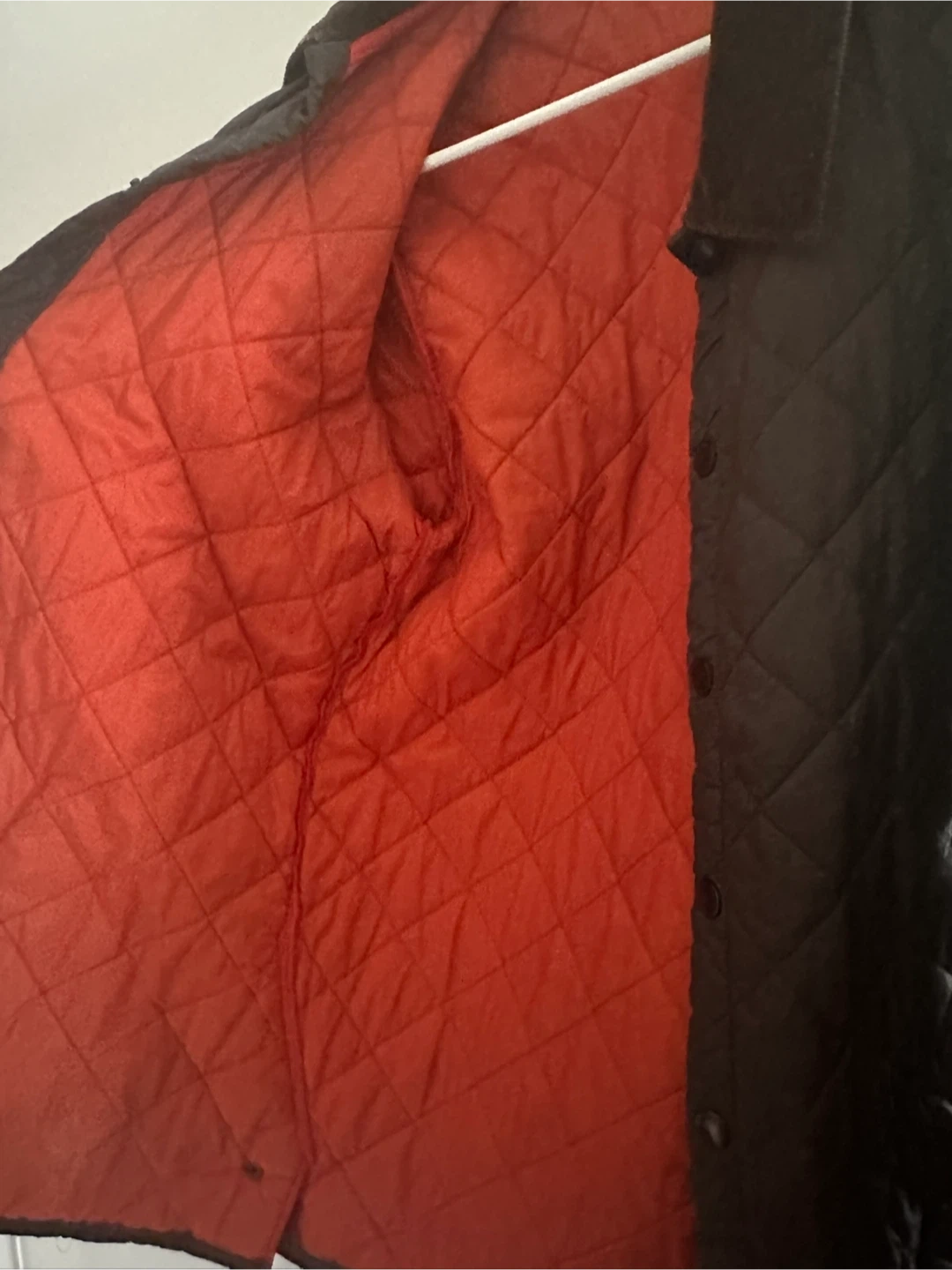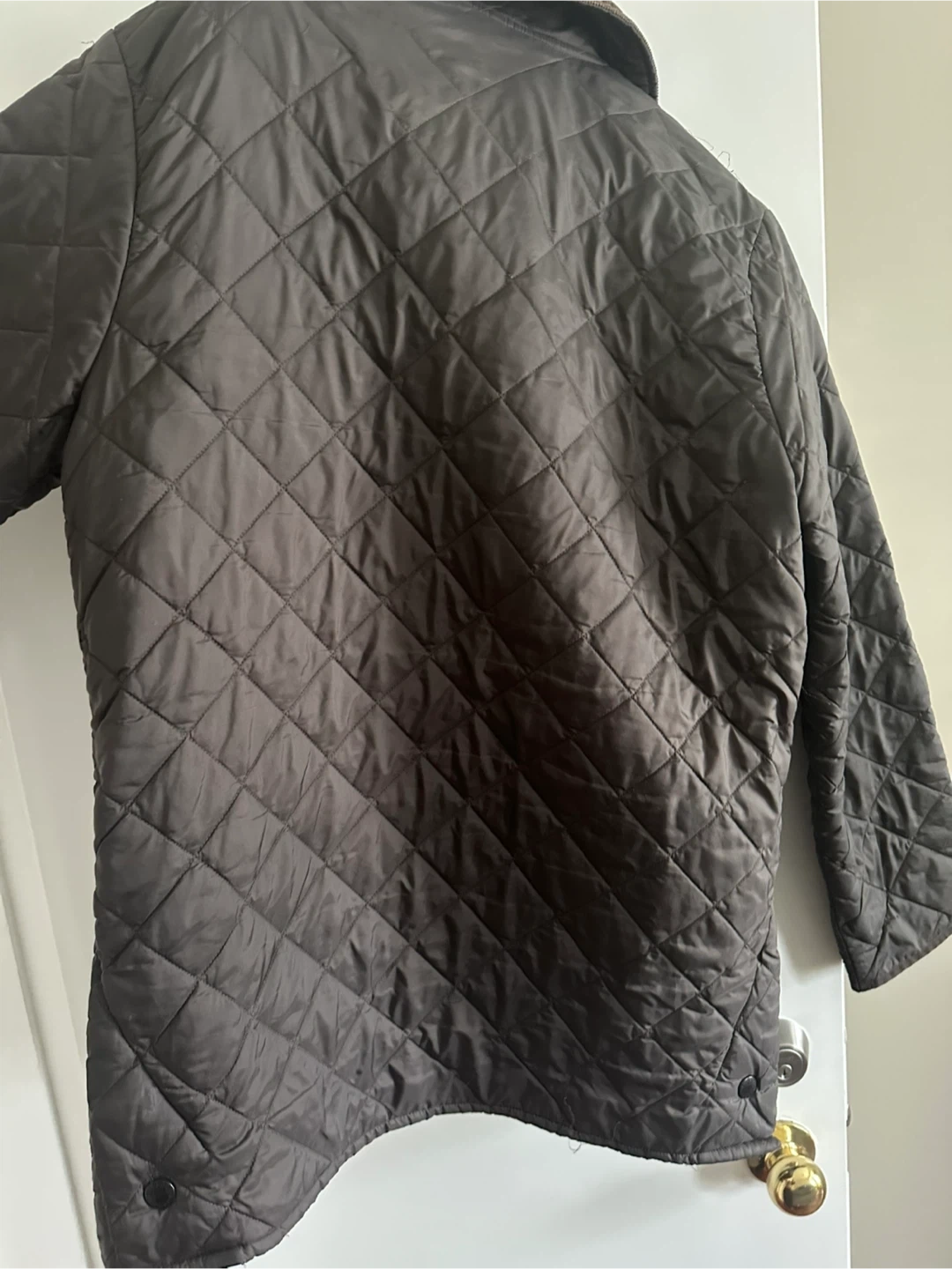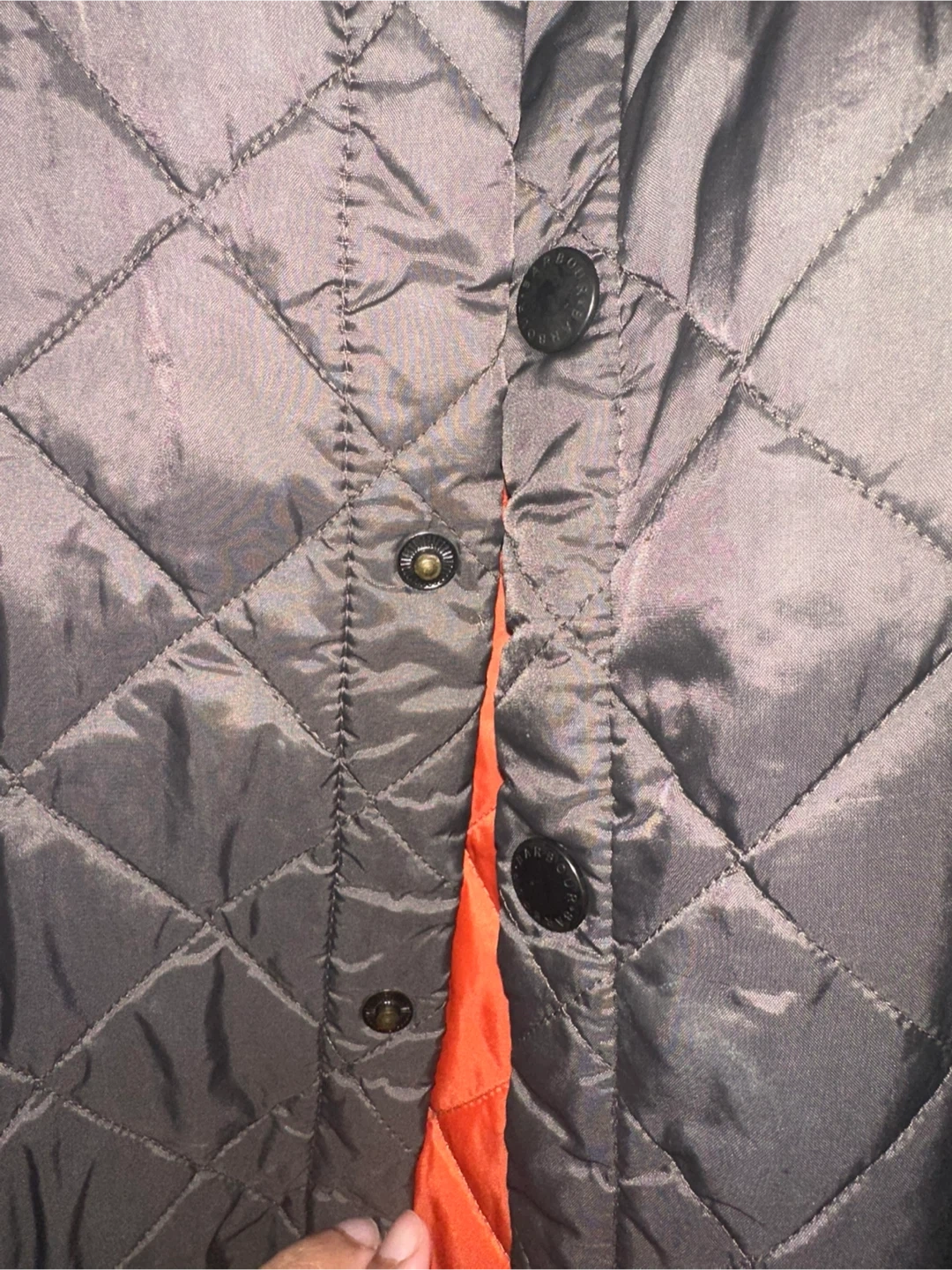 60Classic brown Barbour quilted jacket with a corduroy collar. It's in great condition and ready for a new home! The inside is lined with a vibrant orange quilted fabric. Perfect for adding a touch of British style to your wardrobe. Around mid-thigh in length.