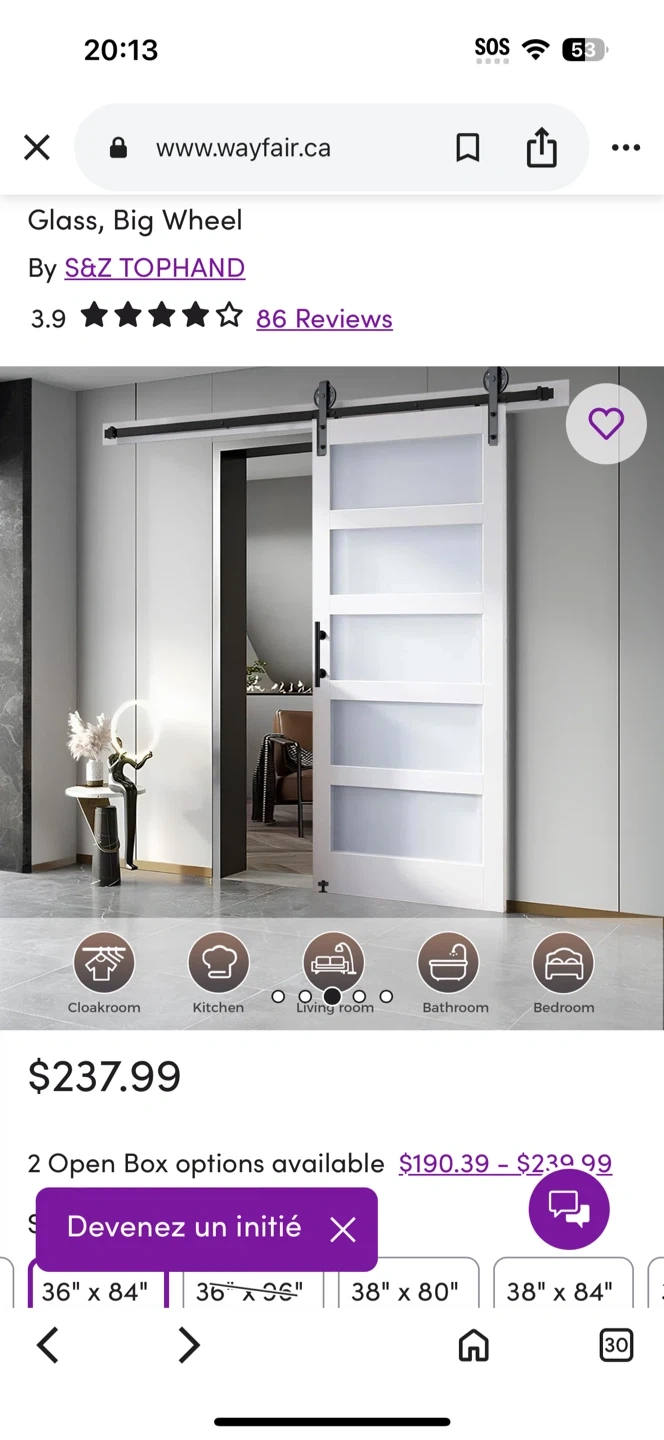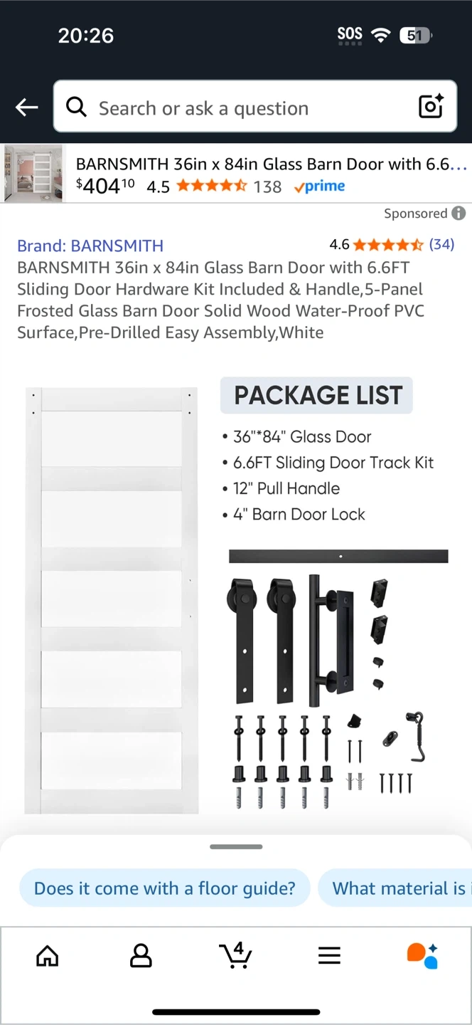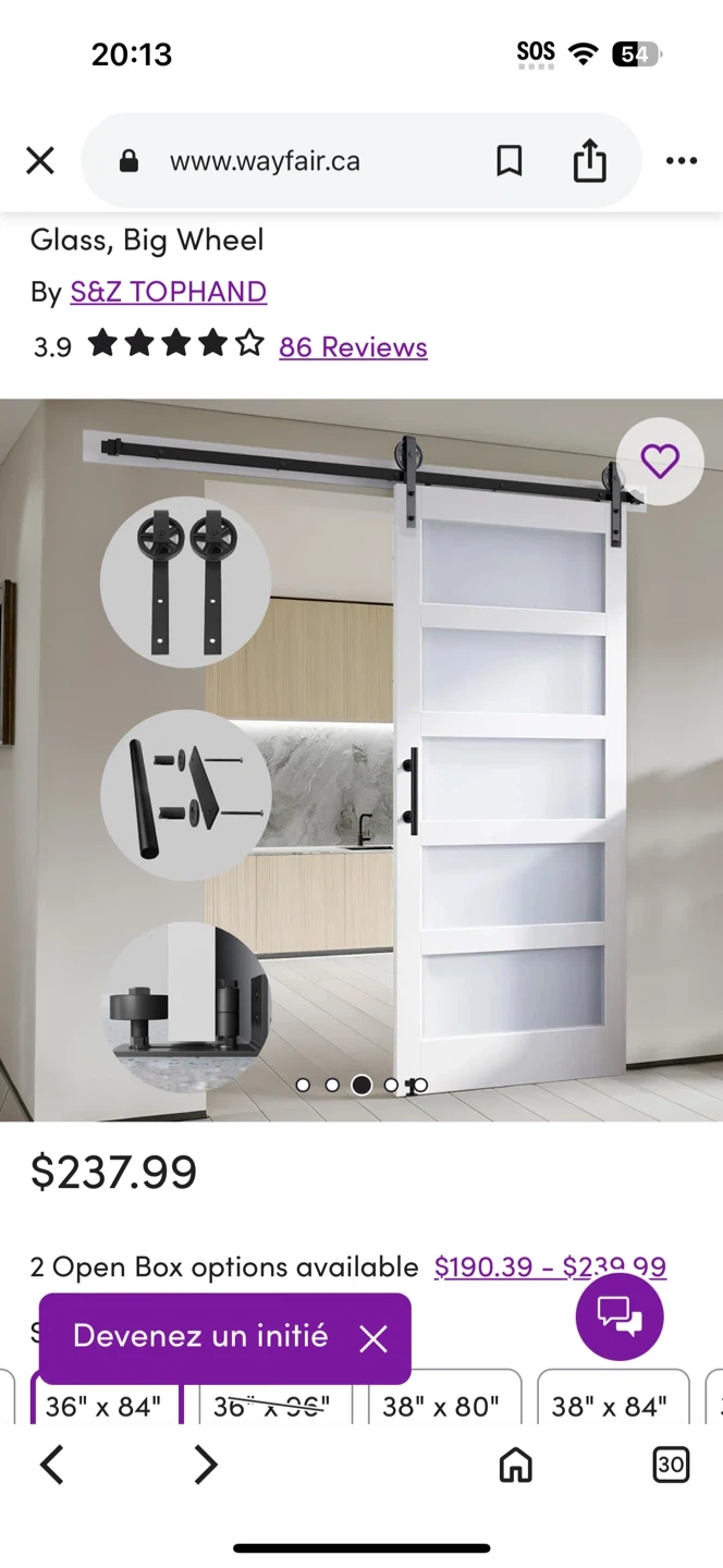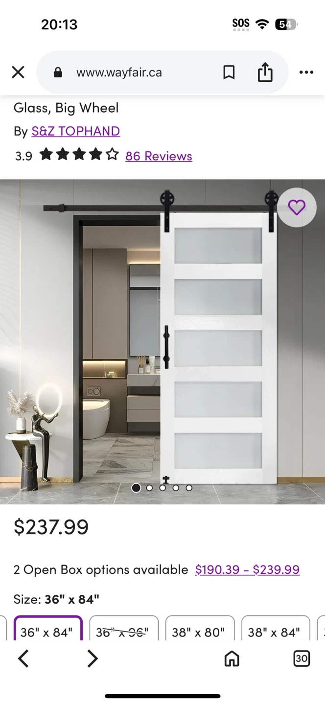 Brand New Barn Door – Never Installed Size: 36” x 84” with 6.6FT sliding rail and hardware 5 frosted glass panels – one glass is broken, four are good All hardware, handle and floor guide included Solid wood with waterproof PVC surface Easy to install, pre-drilled holes