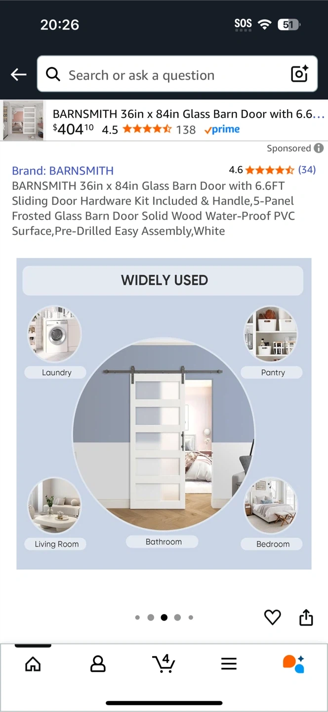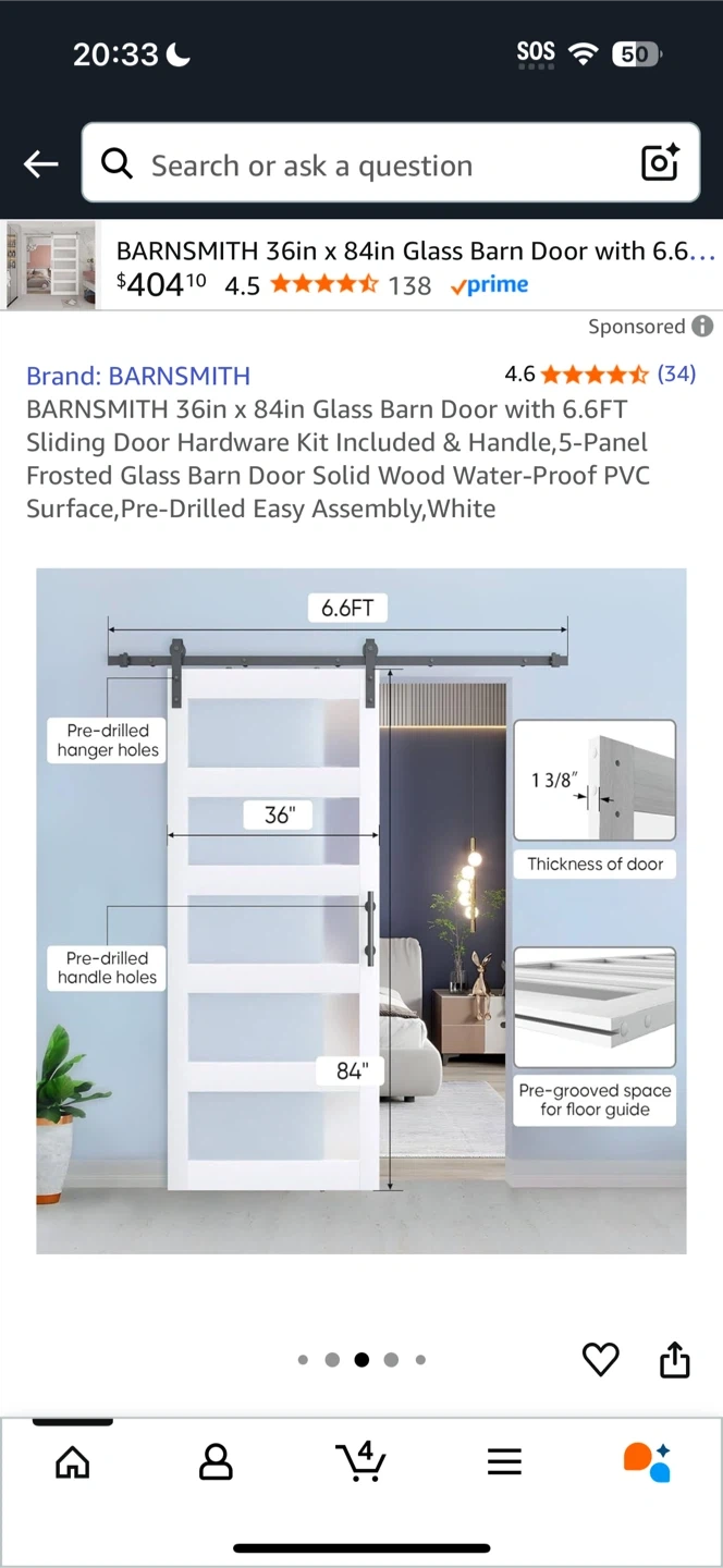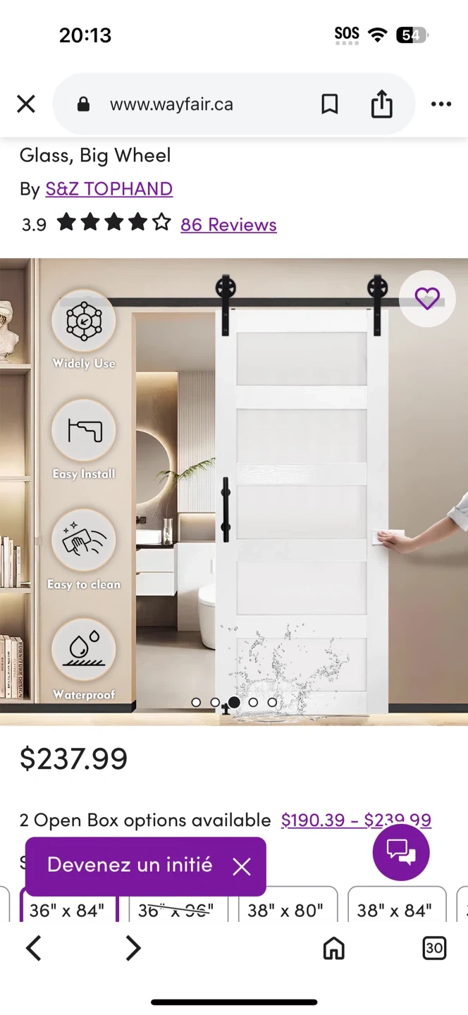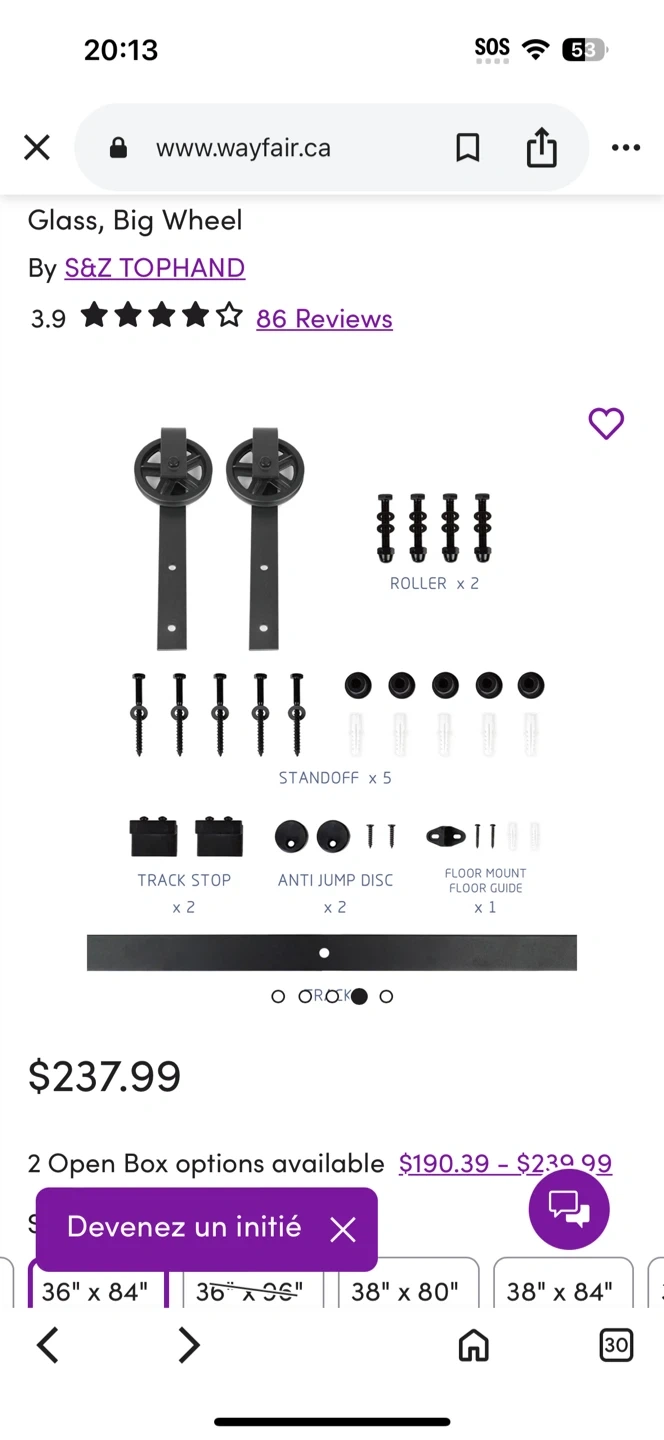 Brand New Barn Door – Never Installed Size: 36” x 84” with 6.6FT sliding rail and hardware 5 frosted glass panels – one glass is broken, four are good All hardware, handle and floor guide included Solid wood with waterproof PVC surface Easy to install, pre-drilled holes