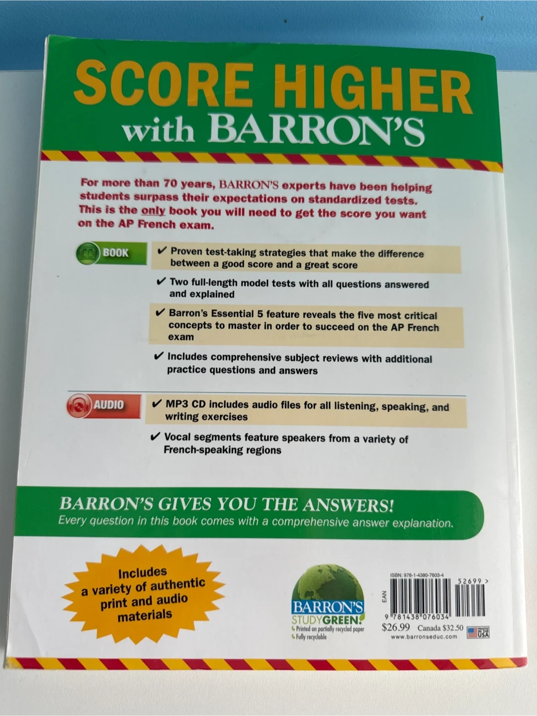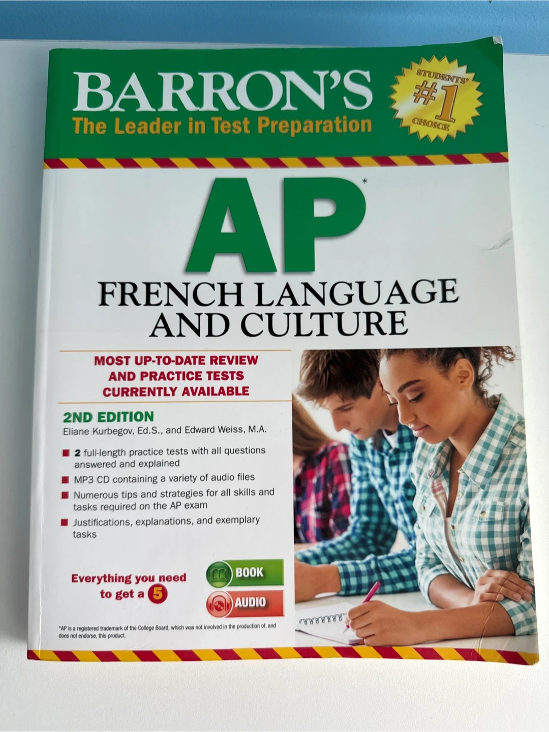 66Selling Barron's AP French Language and Culture, 2nd Edition! This book is great for test preparation and includes a variety of authentic print and audio materials. It features two full-length practice tests with all questions answered and explained, plus an MP3 CD with audio files for listening, speaking, and writing exercises. Originally bought for $26.99 CAD. A little scruffed but was not written in.