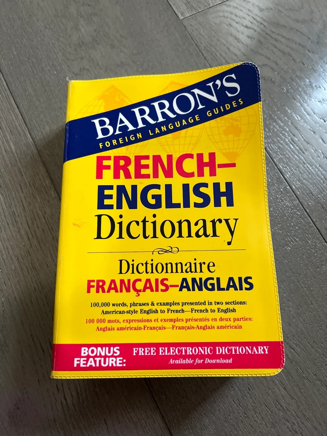 10Selling a Barron's French-English Dictionary! It contains 100,000 words, phrases, and examples presented in two sections: American-style English to French and French to English. Also includes a bonus feature: Free electronic dictionary available for download