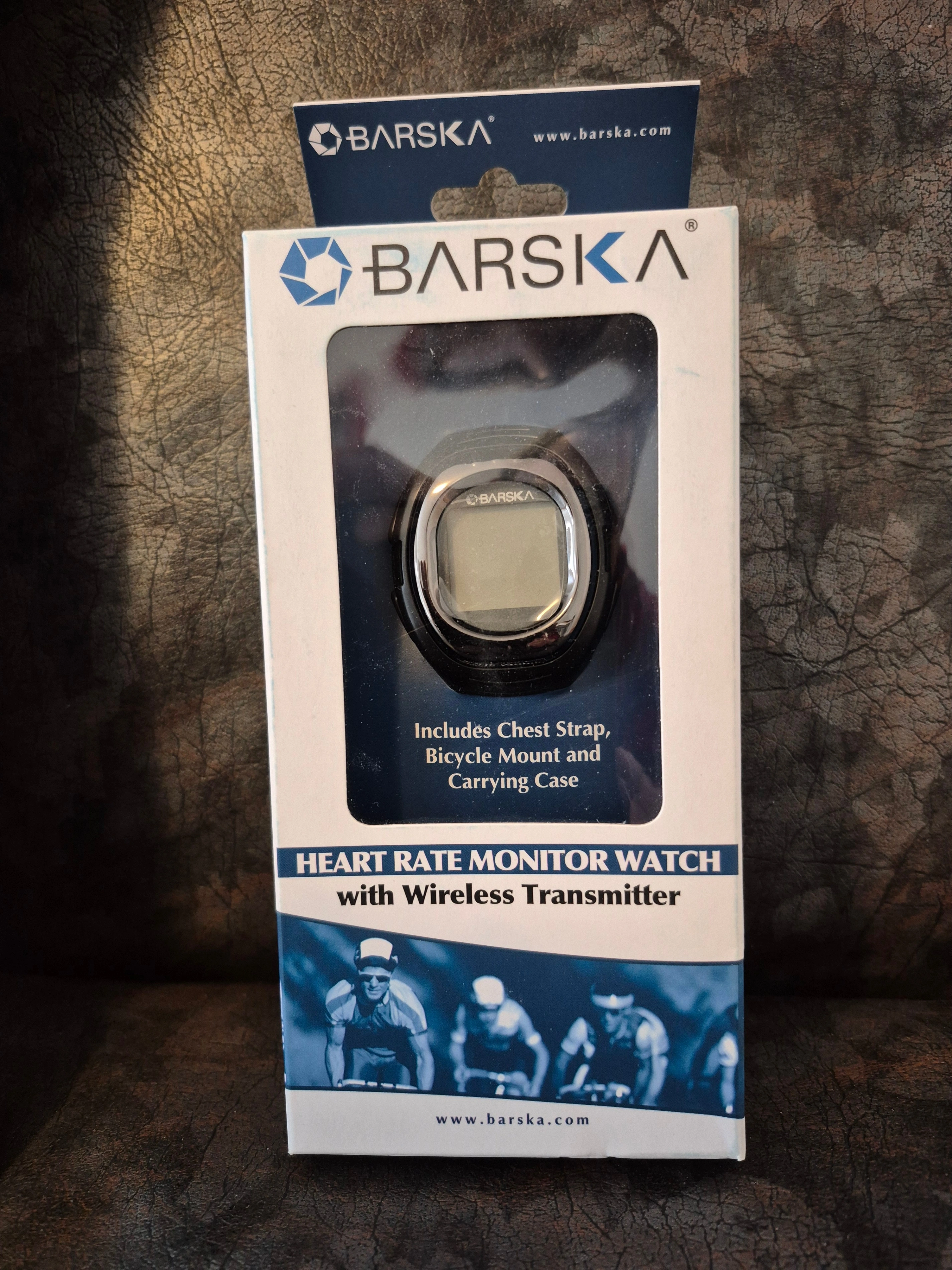 10Brand new heart rate monitor watch. Still in the box and never opened. Includes watch, chest strap, bicycle mount, wireless transmitter and soft carrying case.