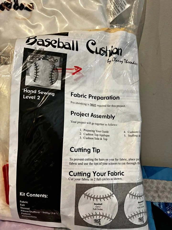 Baseball cushion hand sewing set. Comes with everything you need: pillow form, thread and pattern, etc. Brand new. Pick up near Castle Park Elementary or Como Lake.