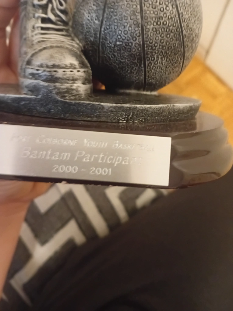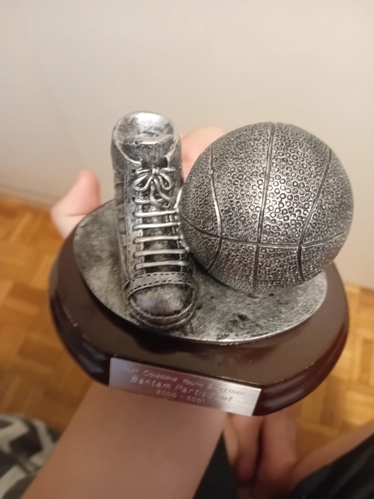 58Showcases a basketball and shoe. Attached to a wooden base. Features an engraved plate. This trophy would look lovely on a shelf.
