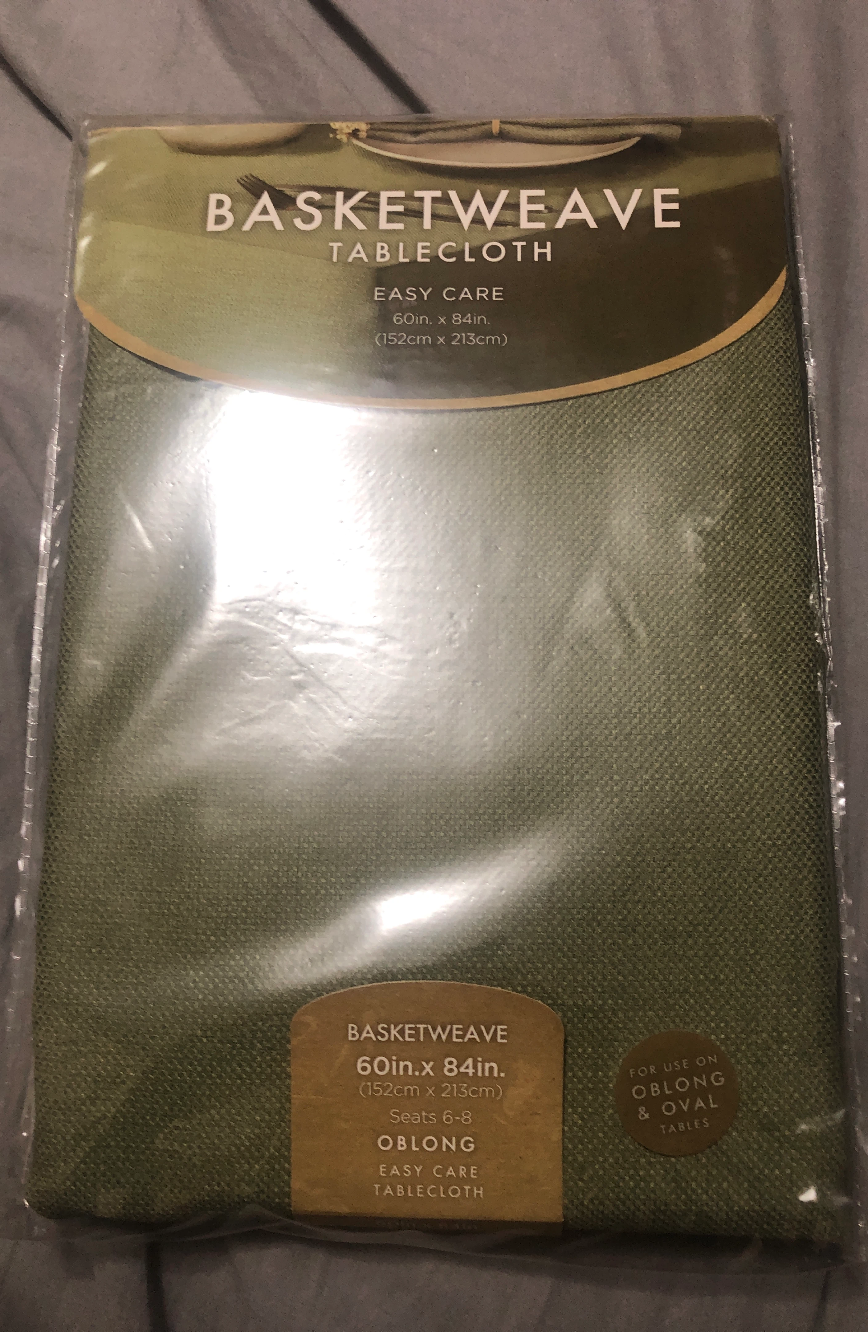 Selling a Basketweave tablecloth, still in its original packaging! It's an easy-care tablecloth, sized at 60 inches by 84 inches (152cm x 213cm). It's designed to seat 6-8 people and is oblong in shape. Perfect for oblong and oval tables