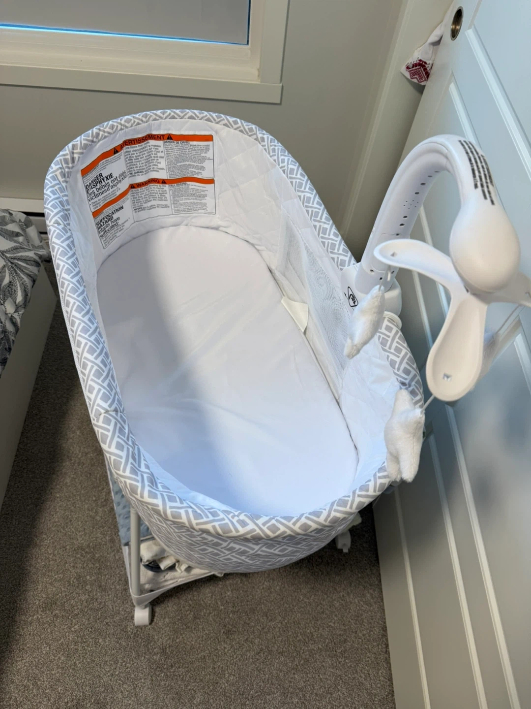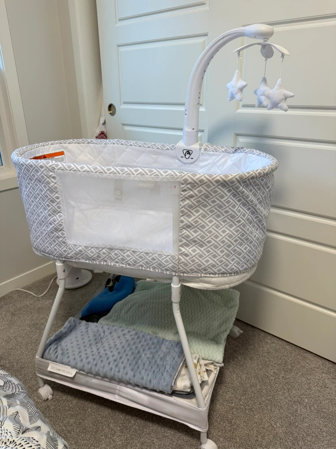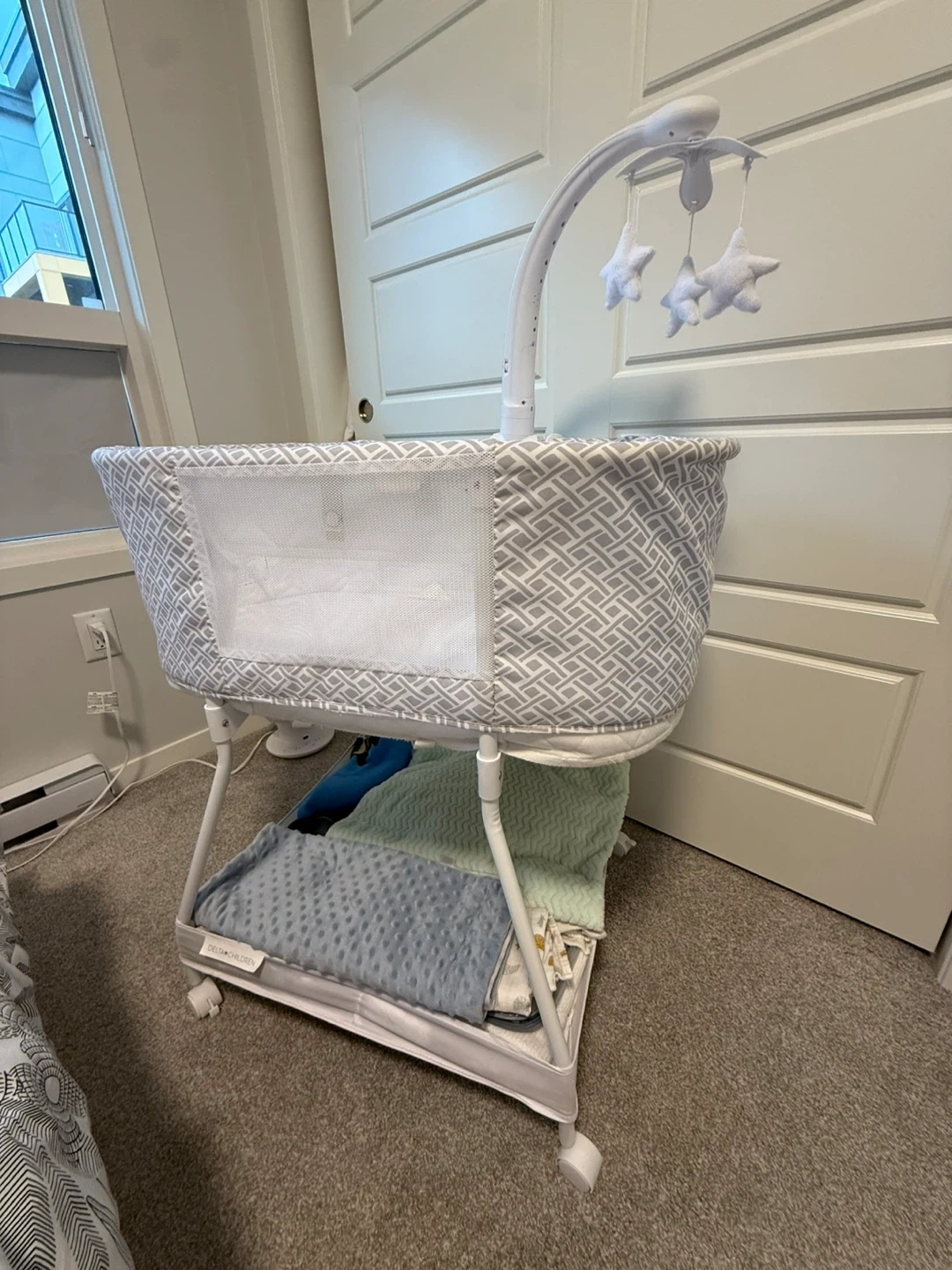 Used for 3 month only attached electronic mobile features spinning toys, a soft-glow nightlight, soothing sounds, vibrations and twinkle lights A breathable mesh window on the side increases airflow and provides a clear view of your sleeping baby. Use it anywhere in the house you need a cozy, safe sleep space for your little one, including your bedroom or living room, its wheels make it easy to move from room to room