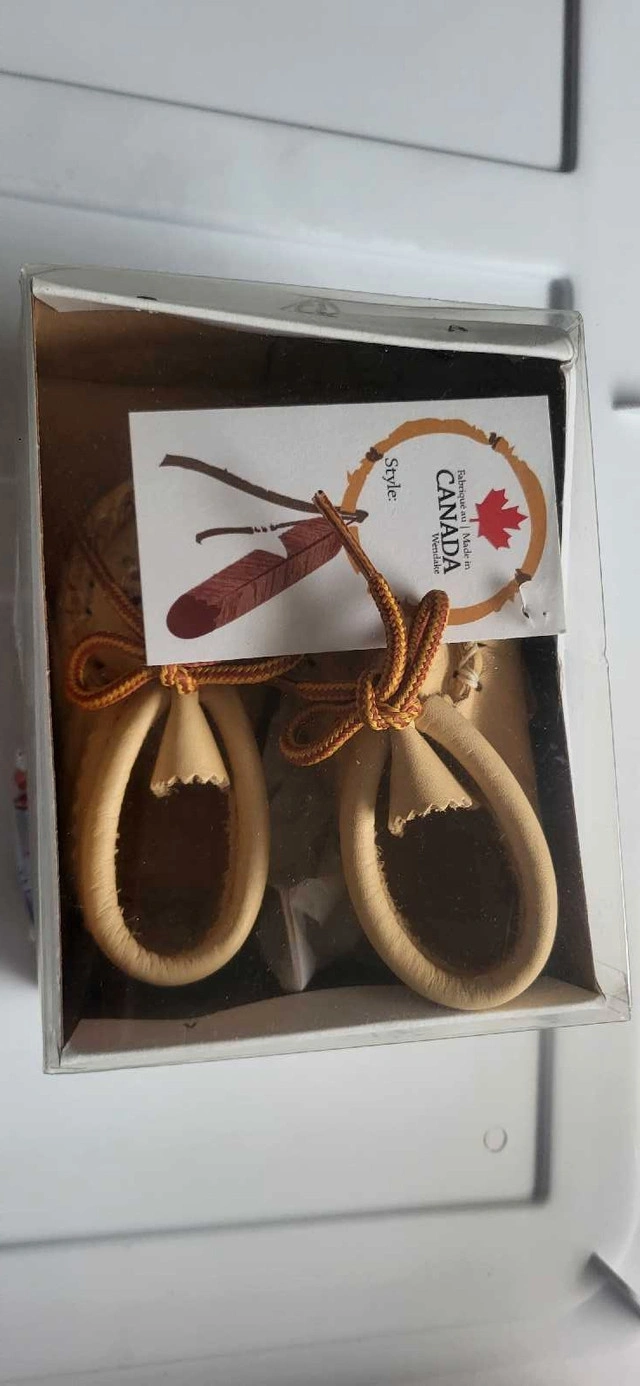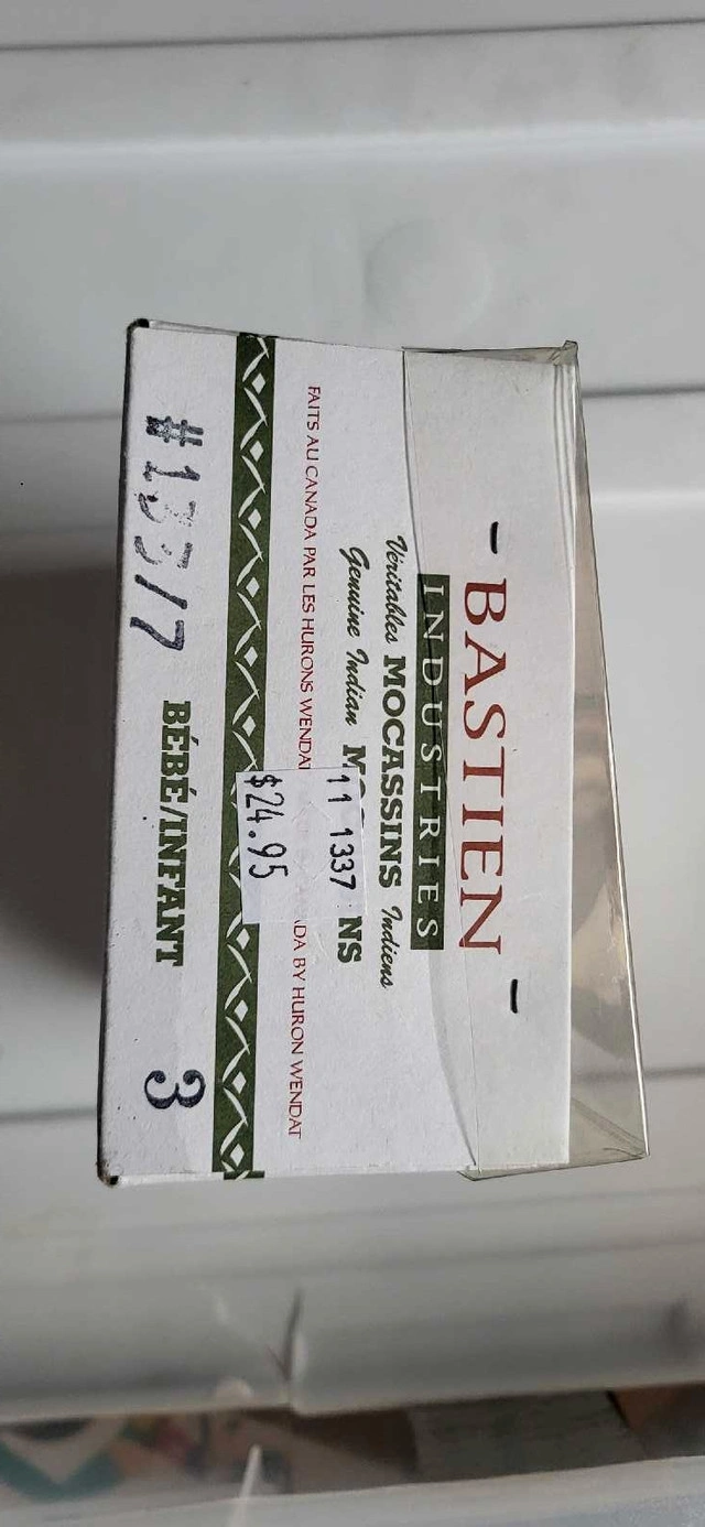 65Keep your little one's feet cozy with these adorable Bastien baby moccasins! These genuine Indian moccasins, size 3. They feature a charming design, perfect for keeping tiny toes warm. Box is a little bent. Why not give your baby the gift of comfort and tradition? If the ad's up, they're available!