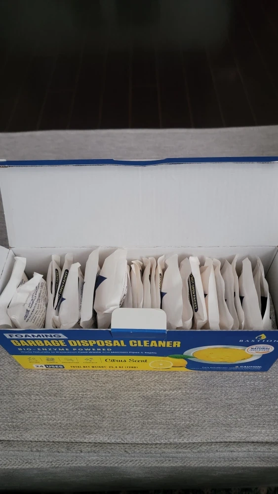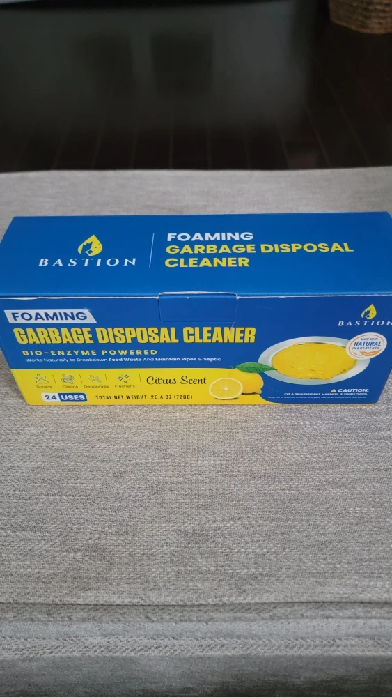 10Selling a box of Bastion Foaming Garbage Disposal Cleaner! It's bio-enzyme powered and works naturally to break down food waste. Helps maintain pipes and septic systems too. Each box has 24 uses and a total net weight of 25.4 oz (720g). Comes in a refreshing citrus scent!