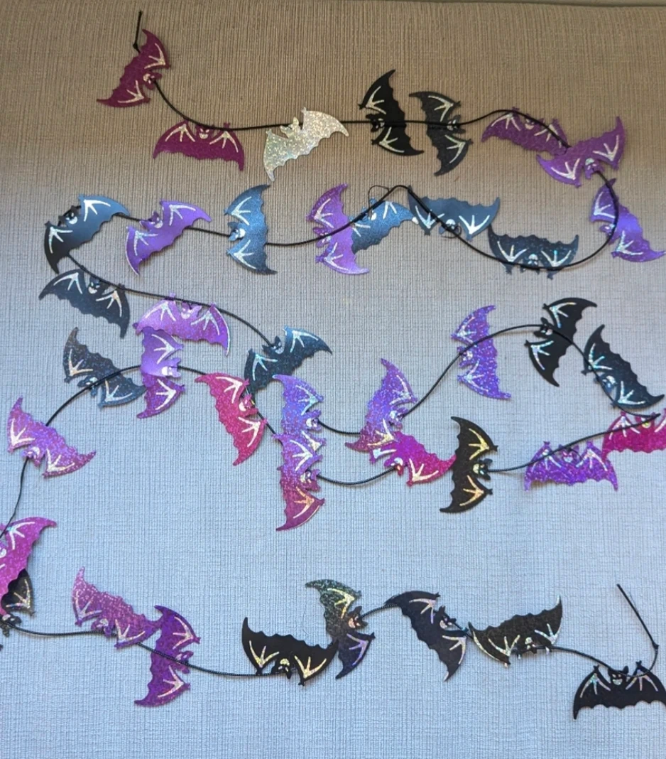 583Spooky season is coming! Get ready with this fun bat garland. It features a variety of bats in different colours like purple, black, and blue with glitter accents. Perfect for adding a festive touch to your Halloween decor
