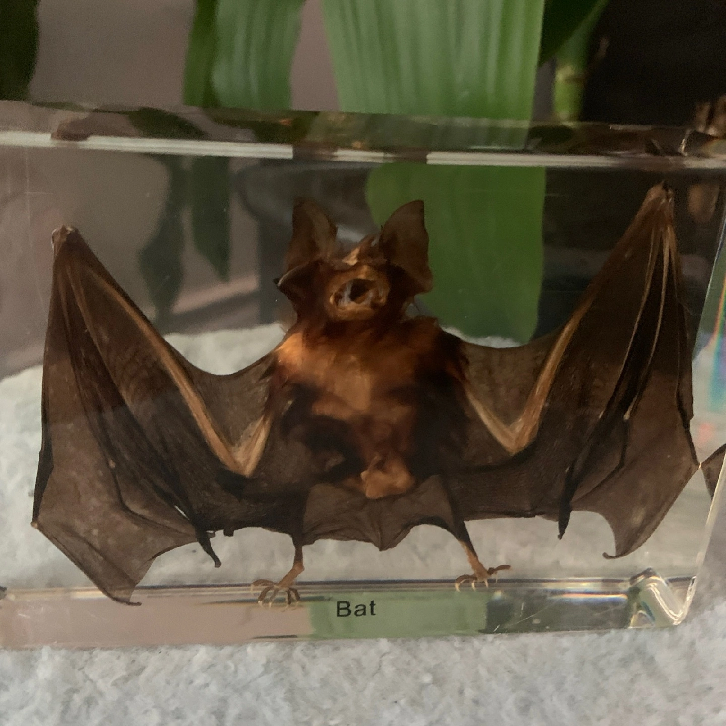 10Selling a bat specimen encased in a clear lucite block. It's a unique piece for collectors or those interested in natural history. The block measures approximately 5 inches in length, as shown in the photos. It's in good condition and ready to be displayed