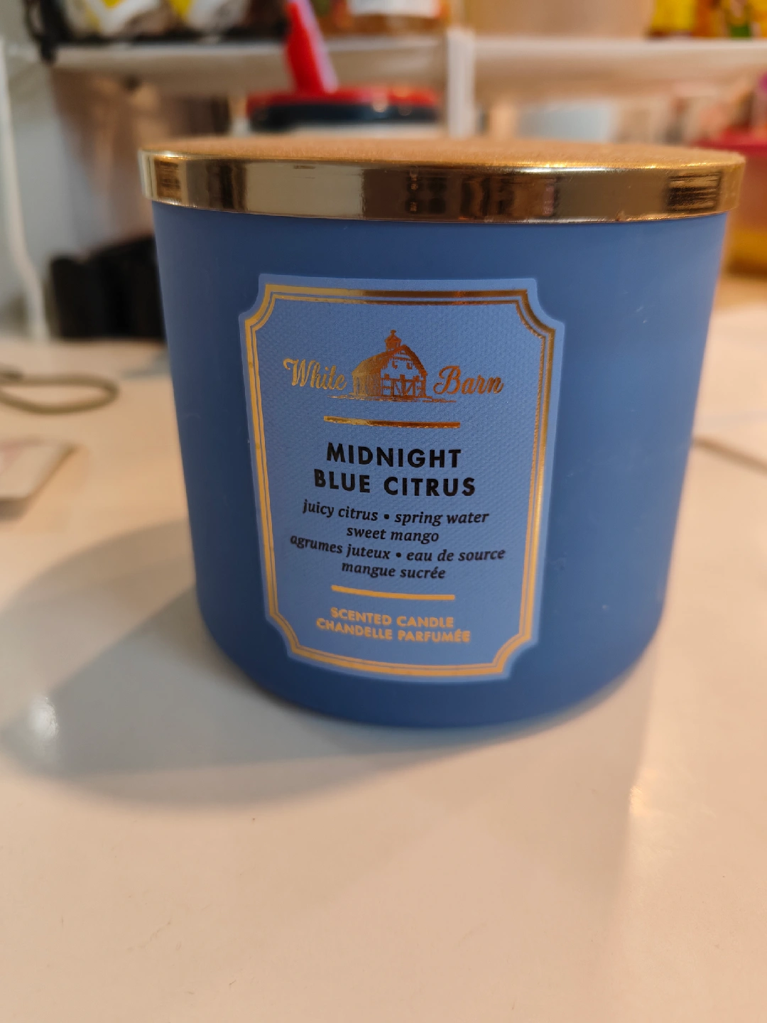 16Selling a White Barn Midnight Blue Citrus scented candle! It smells like juicy citrus, spring water, and sweet mango. A great scent for any room