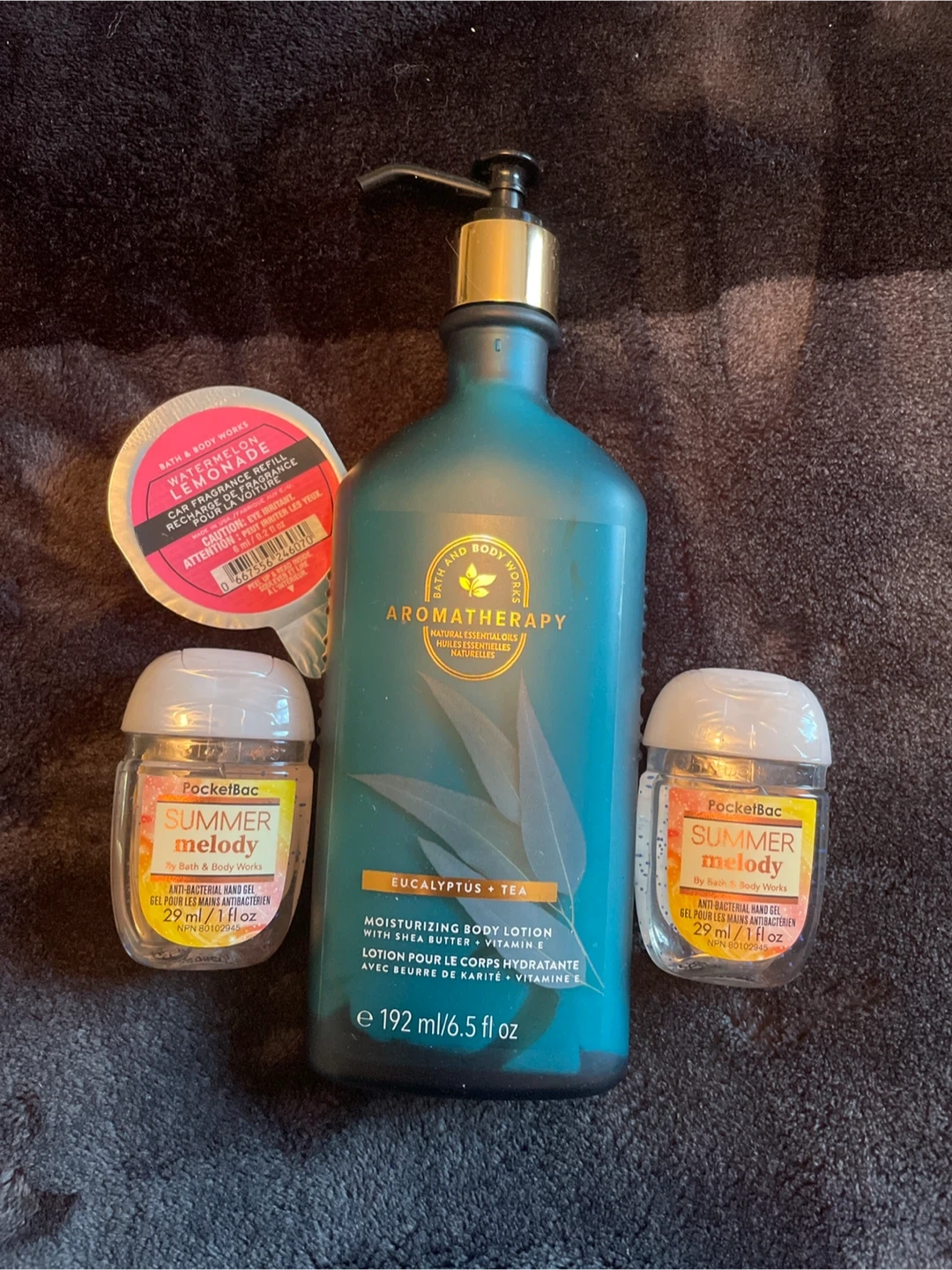 26Selling a set of Bath & Body Works goodies! Included is an Aromatherapy Eucalyptus + Tea moisturizing body lotion (192 ml/6.5 fl oz), two PocketBac Summer Melody anti-bacterial hand gels (29 ml/1 fl oz each), and a Watermelon Lemonade car fragrance refill (6 ml/0.2 fl oz)