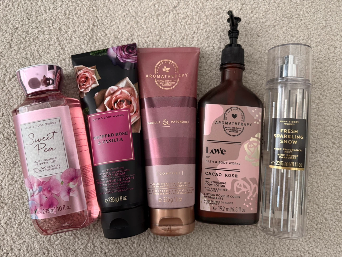 Selling a variety of Bath & Body Works Items. $25 for all or $6 each Includes: - Sweet Pea Aloe + Vitamin E Shower Gel (295 mL/10 fl oz) - Whipped Rose & Vanilla Ultimate Hydration Body Cream (226 g/8 oz) - Aromatherapy Vanilla & Patchouli Ultimate Hydration Body Cream (226 g/8 oz) - Aromatherapy Love Cacao Rose Moisturizing Body Lotion (192 mL/6.5 fl oz) - Fresh Sparkling Snow Fine Fragrance Mist (236 mL/8 fl oz)