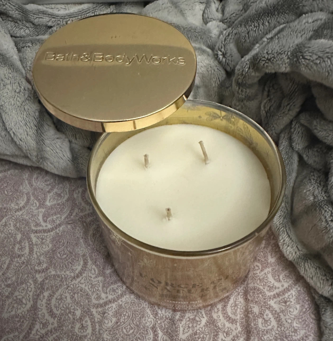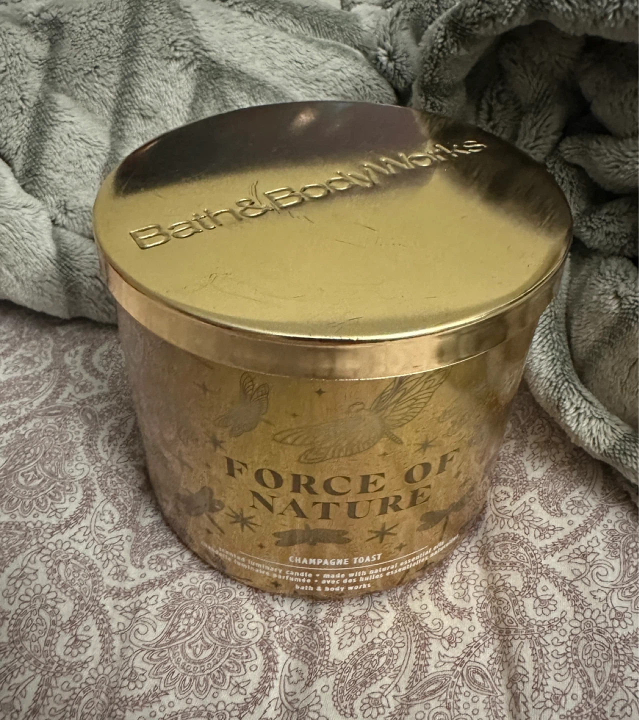 Bath & Body Works Force of Nature Champagne Toast candle. It's a beautiful candle with a lovely scent. Perfect for creating a cozy atmosphere in your home!