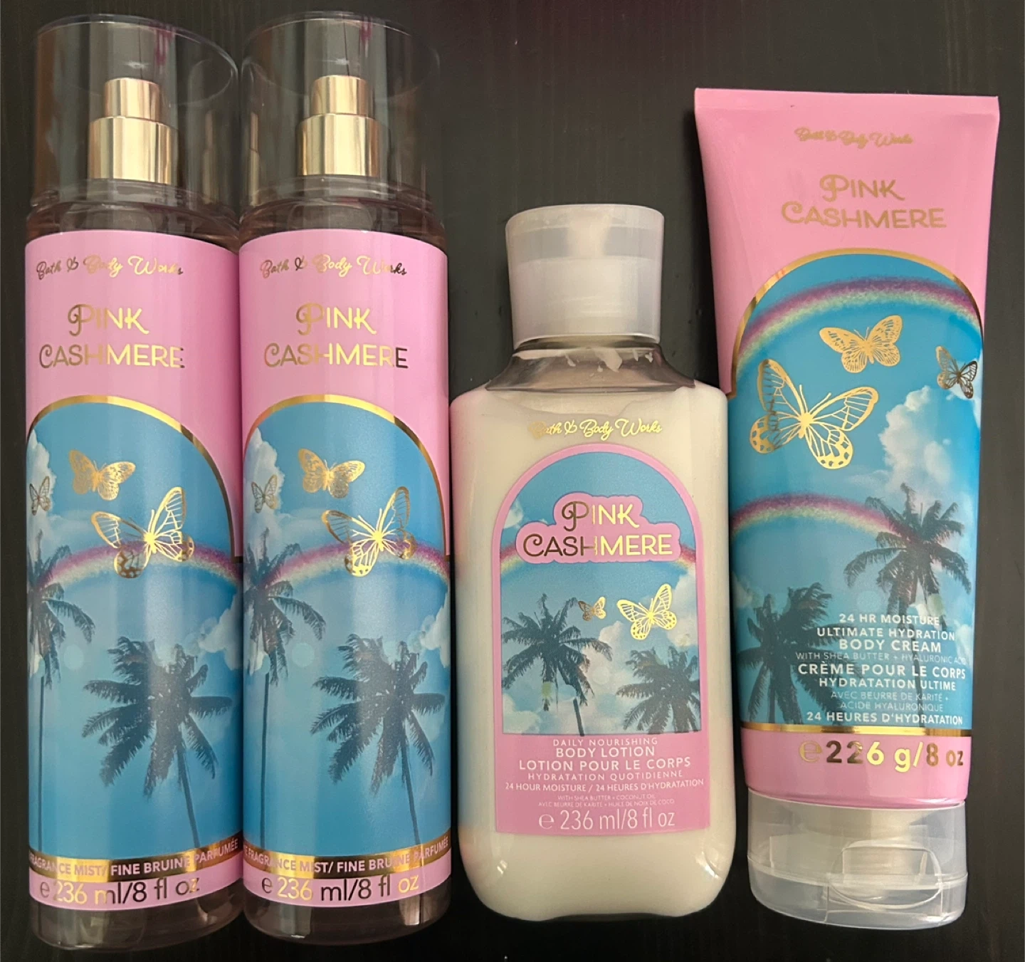 Selling a Bath & Body Works Pink Cashmere set! Includes: - 2 Fragrance Mists (236 ml/8 fl oz each) - 1 Daily Nourishing Body Lotion (236 ml/8 fl oz) - 1 Ultimate Hydration Body Cream (226 g/8 oz) All items are in excellent condition and ready to find a new home All for $75- Price Firm
