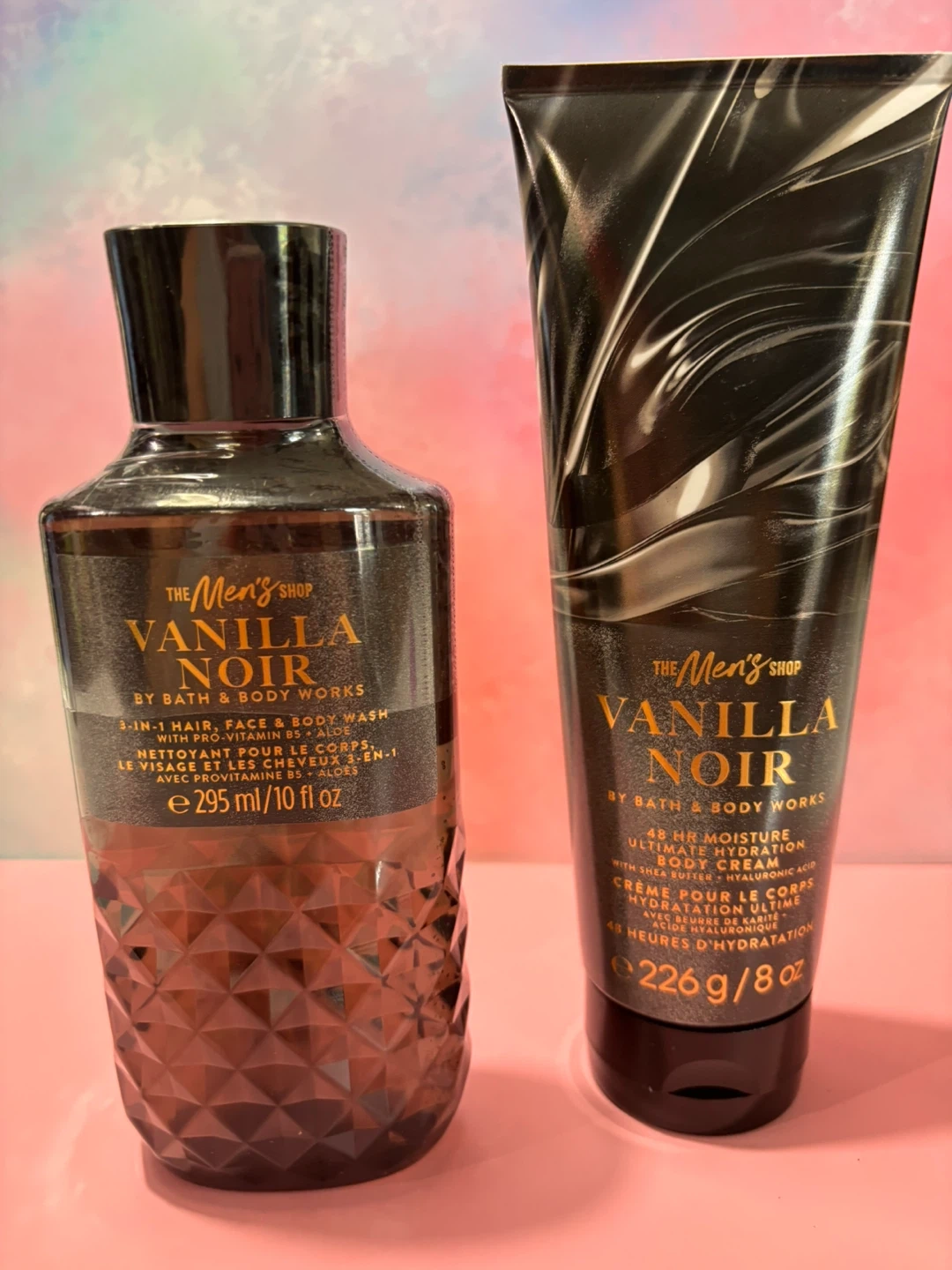 Selling a Bath & Body Works Vanilla Noir set from The Men's Shop! Includes a 3-in-1 hair, face, and body wash (295 ml/10 fl oz) and a 48-hour moisture ultimate hydration body cream (226g/8 oz)