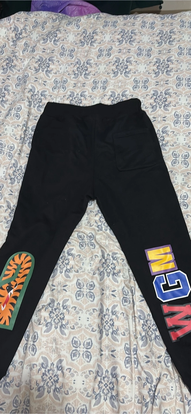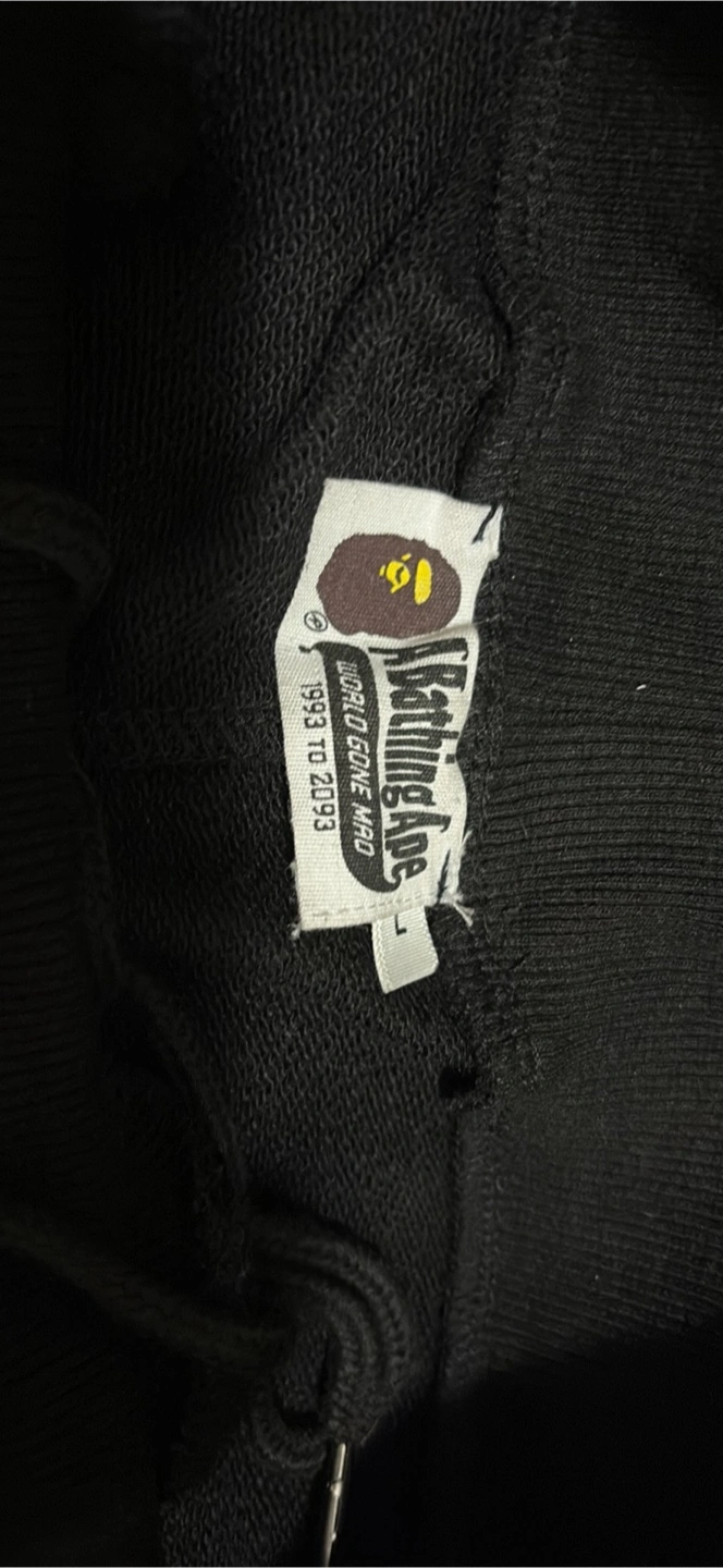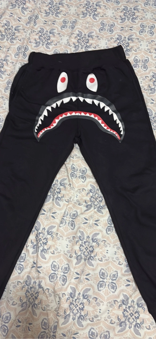Selling a pair of Bathing Ape sweatpants in black. These are a size large and feature a shark design on the front and other colourful graphics down the legs. They're in great condition!