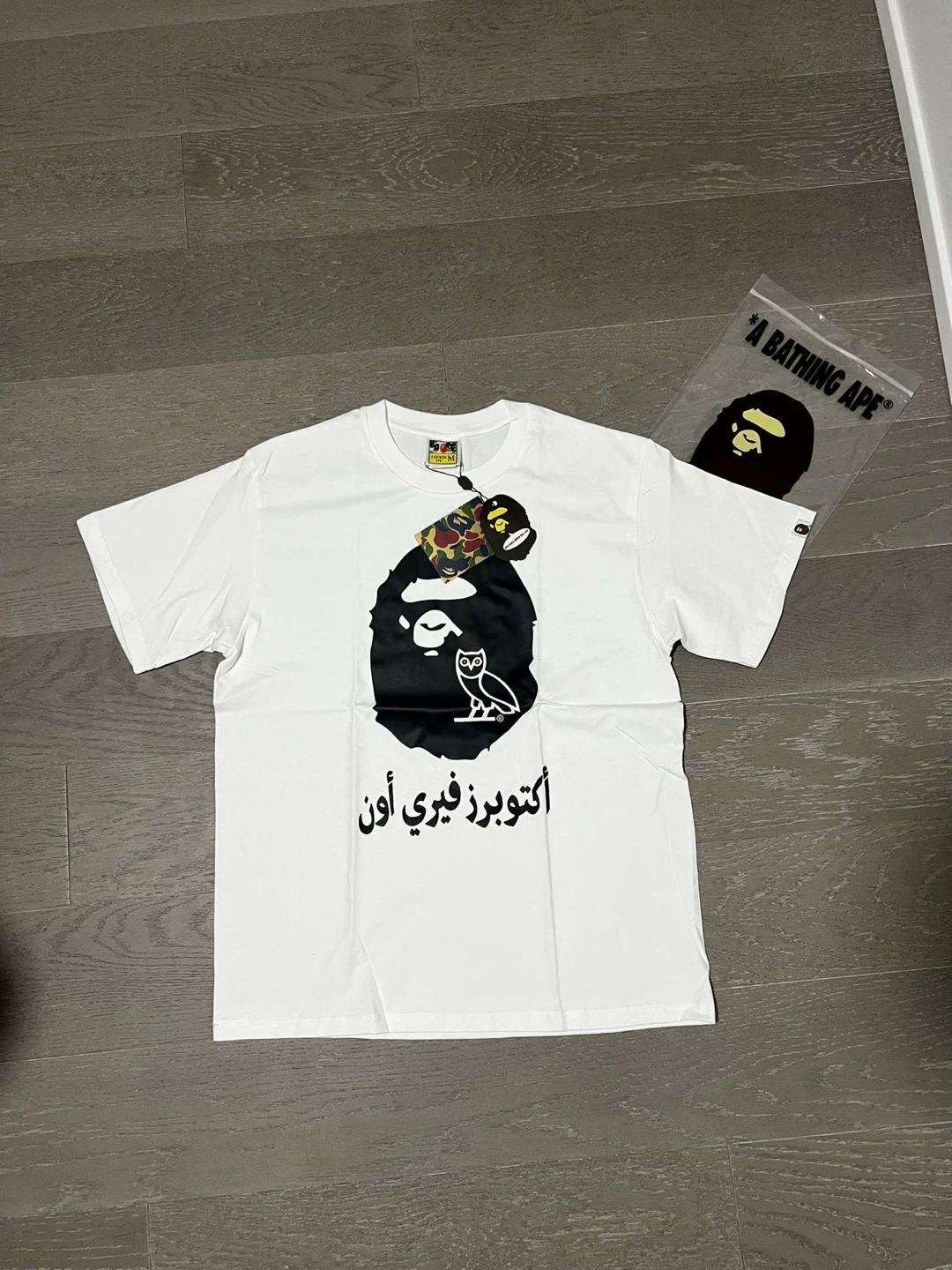 Selling a Bathing Ape (BAPE) x OVO collaboration T-shirt in size medium. It's white with the iconic BAPE ape head graphic combined with the OVO owl logo. Comes with the original packaging!