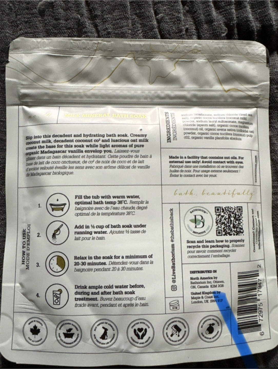 15Creamy coconut milk bath soak. Madagascar vanilla scent. Hydrating and decadent. 250g/9oz pouch. Relax in a warm bath.