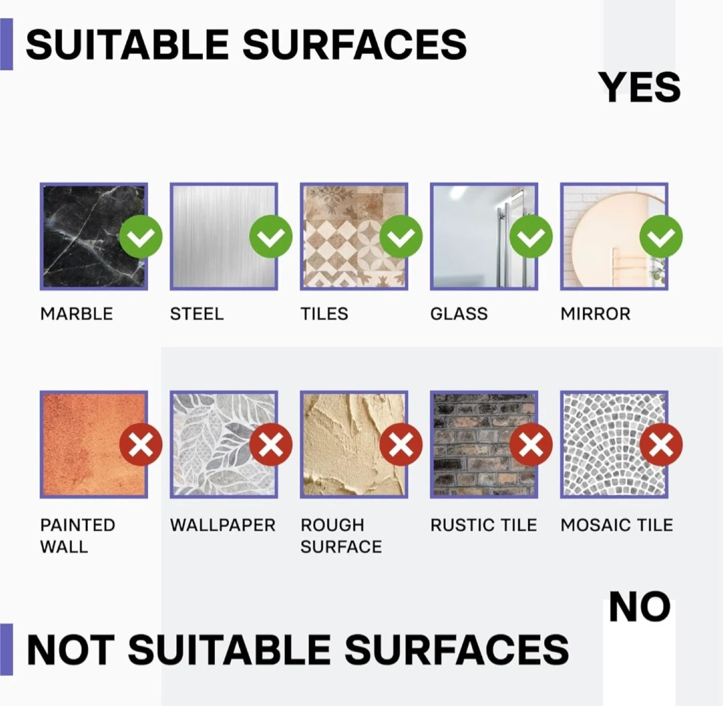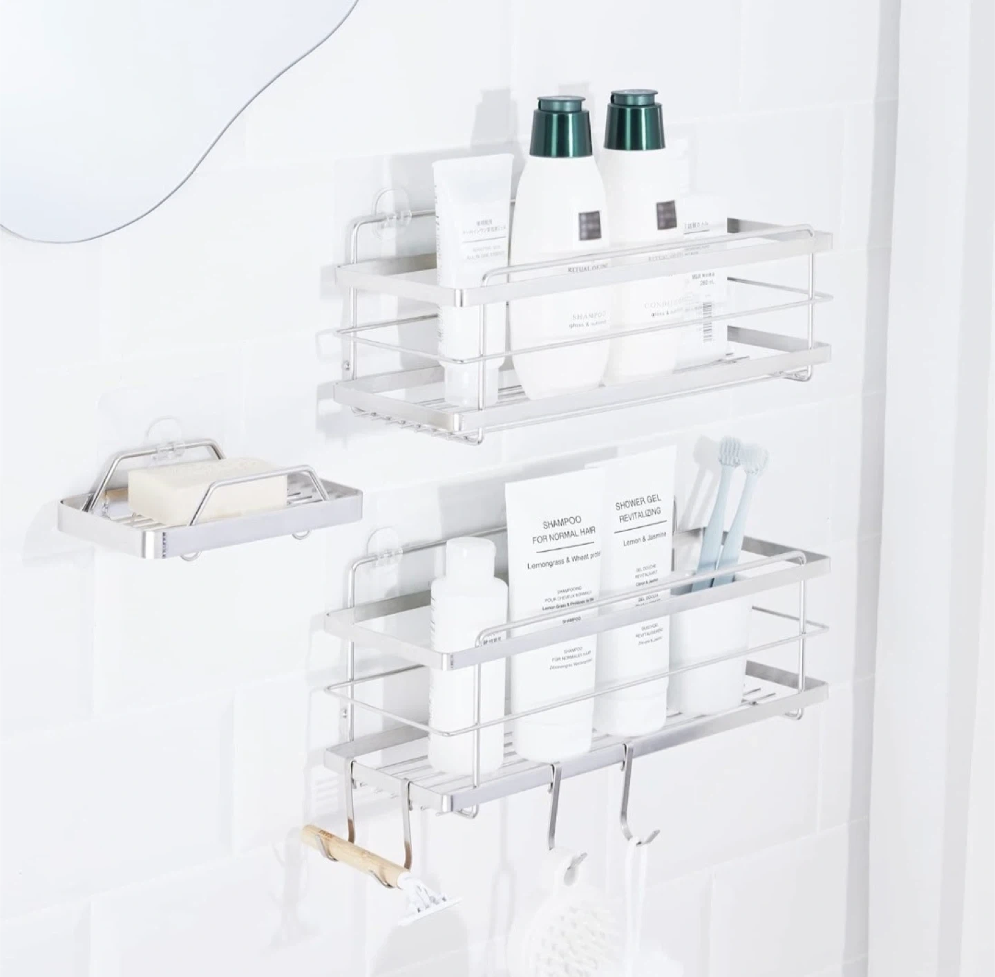 57Keep your bathroom essentials organized with this handy silver shelf organizer! It's perfect for storing shampoo, shower gel, and other items. The dimensions are approximately 12.2" x 4.5" x 3.4" for the larger shelf and 5" x 4.5" x 3.9" for the smaller one. It also includes adhesive stickers for easy installation on suitable surfaces like marble, steel, tiles, glass, and mirrors