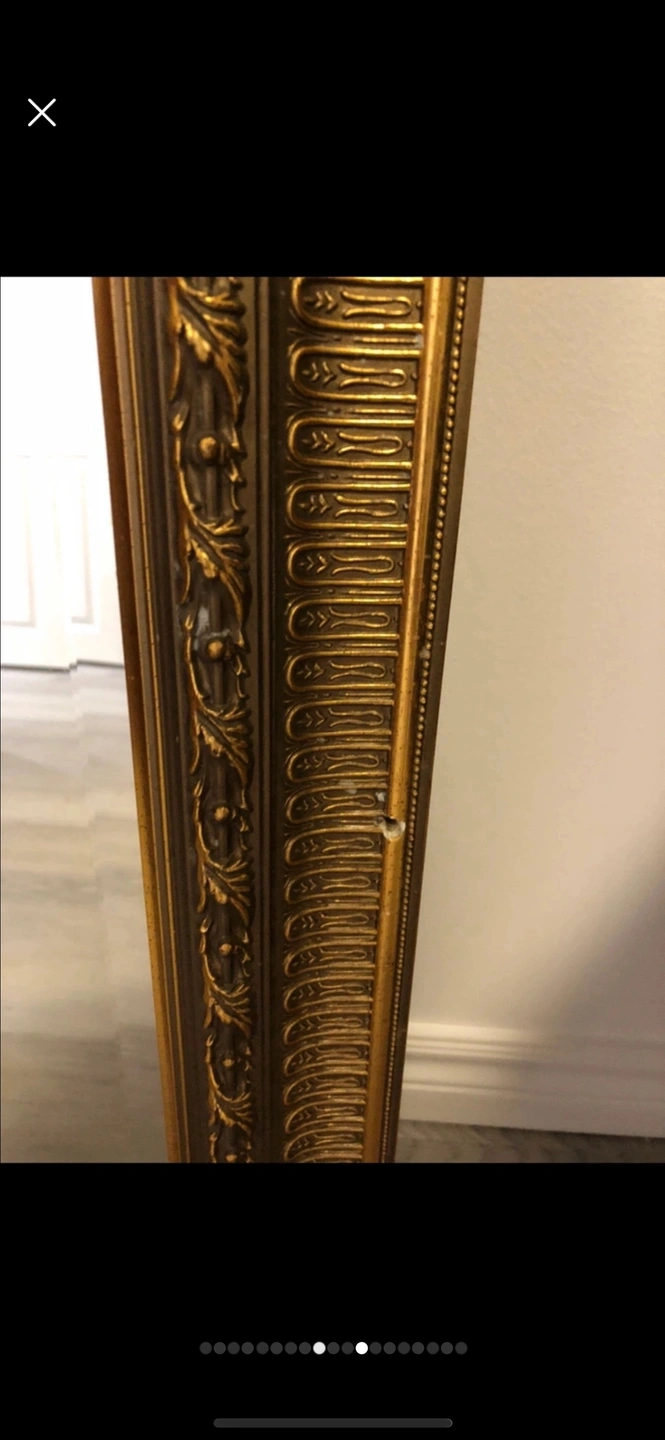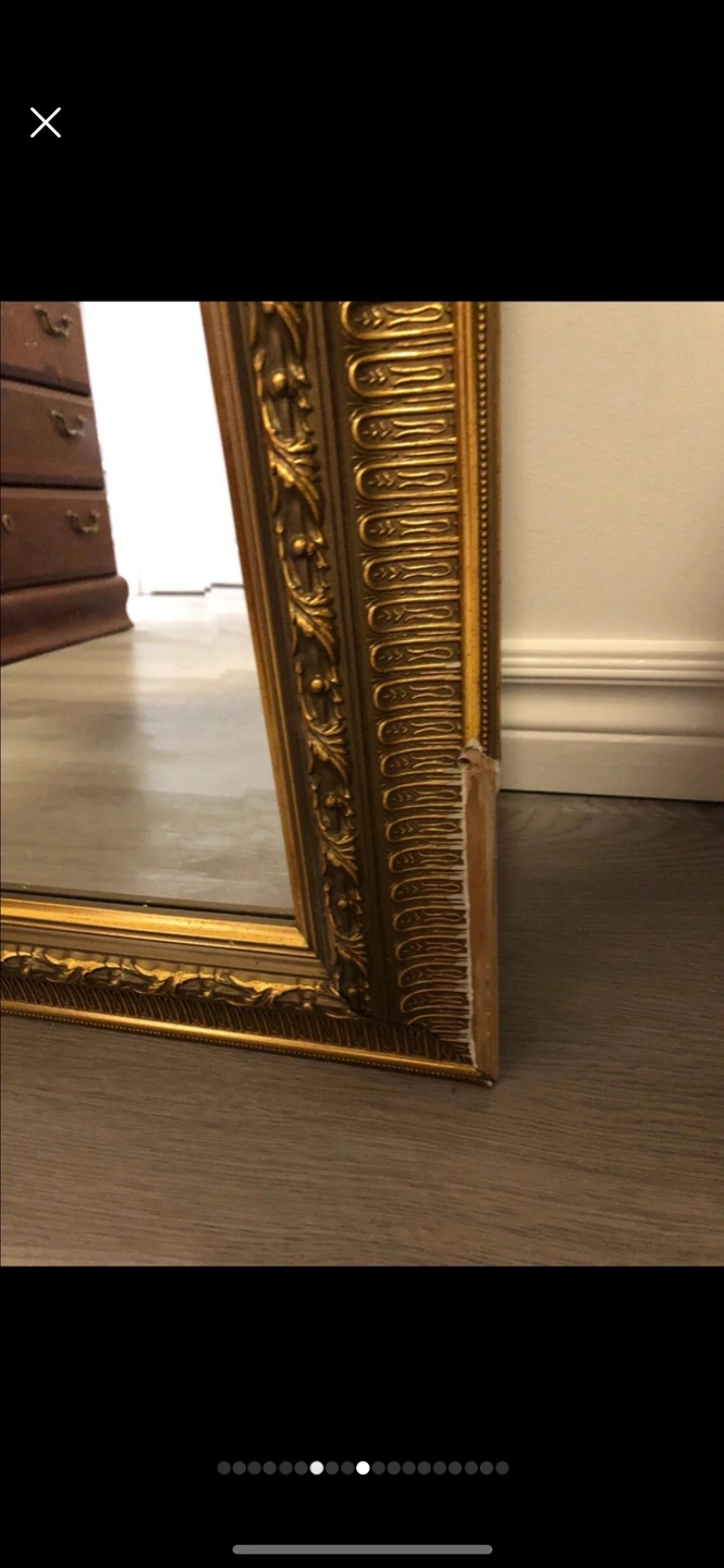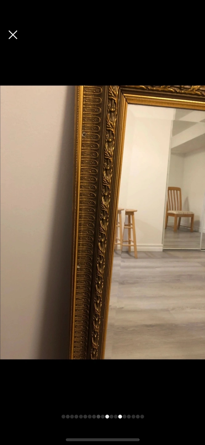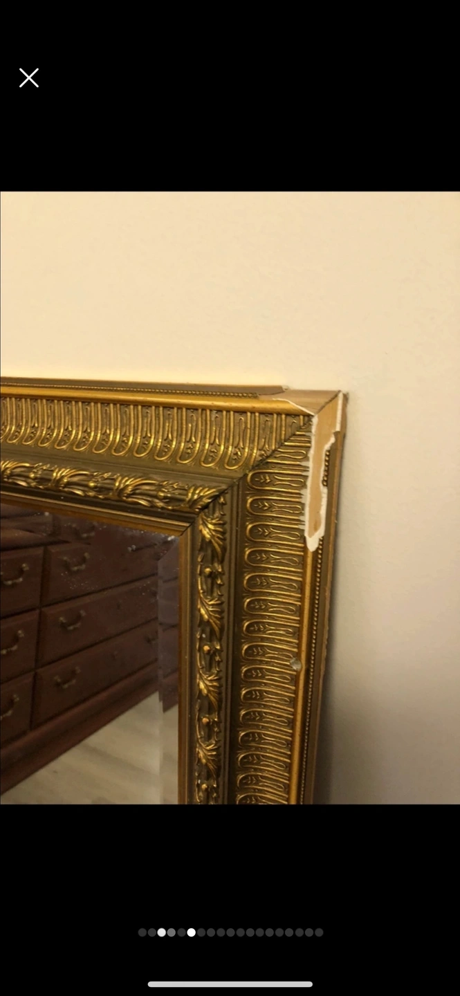 PICK UP in Mississauga Ontario by Mavis & dundas ——NO DELIVERY —— - good useable condition -mirror is not cracked -Flaws on the frame in the 3 corners (shown in image) -could repaint it as DIY project Length: 30” height: 42.5”