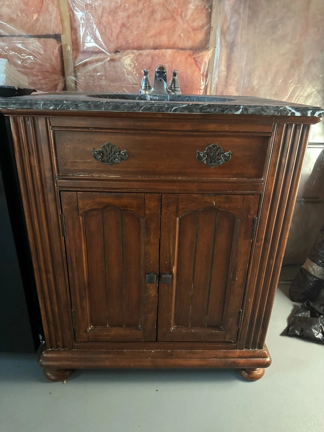 10Beautiful solid wood vanity with a dark marble top and built-in sink. Classic design with lots of character. In good shape – just needs faucet hookups. Great for a bathroom reno or cottage! Solid wood includes matching mirror. Marble top with sink included and faucet. Approx. 36” wide. There are two available - will sell them both with mirror for $275. $150 OBO. Pickup only