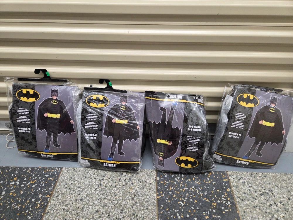 Selling a Batman costume, size medium (8-10). This costume includes 4 pieces: a muscle jumpsuit with attached boot covers, a mask, a cape, and a belt! Perfect for Halloween or dress-up!
