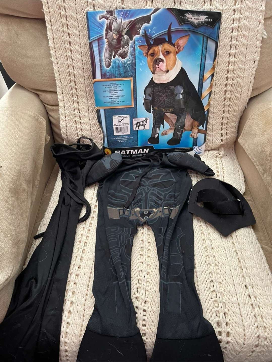 Get your furry friend ready for Halloween or a costume party with this Batman dog costume! It includes a headpiece and jumpsuit with attached arms and a cape. Your pup will be the hero of the night!