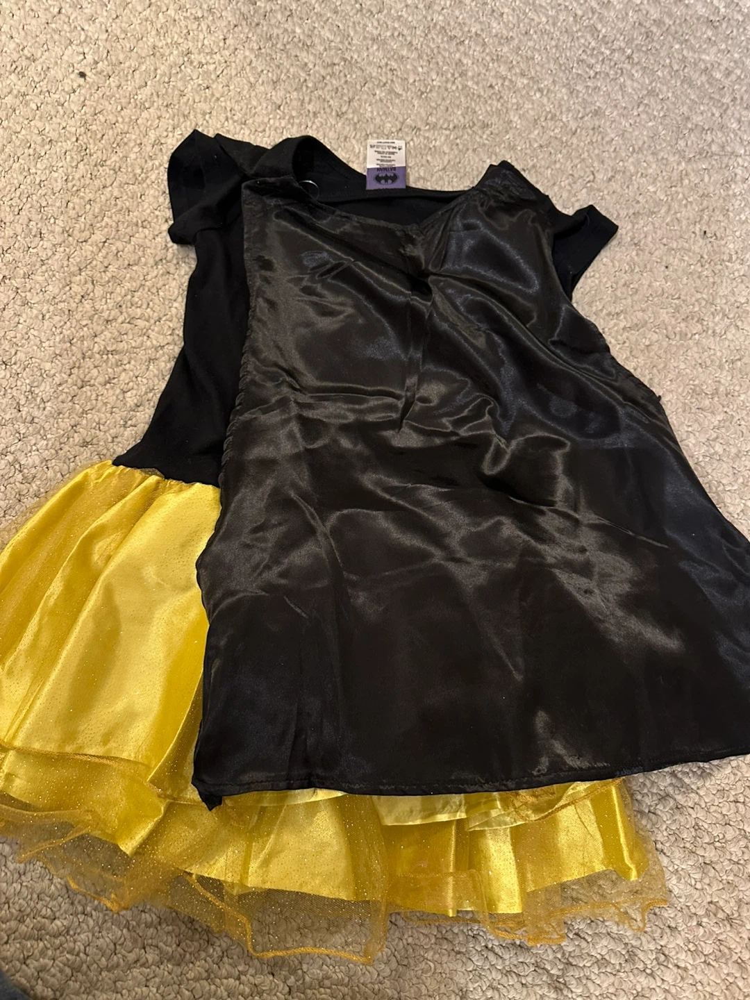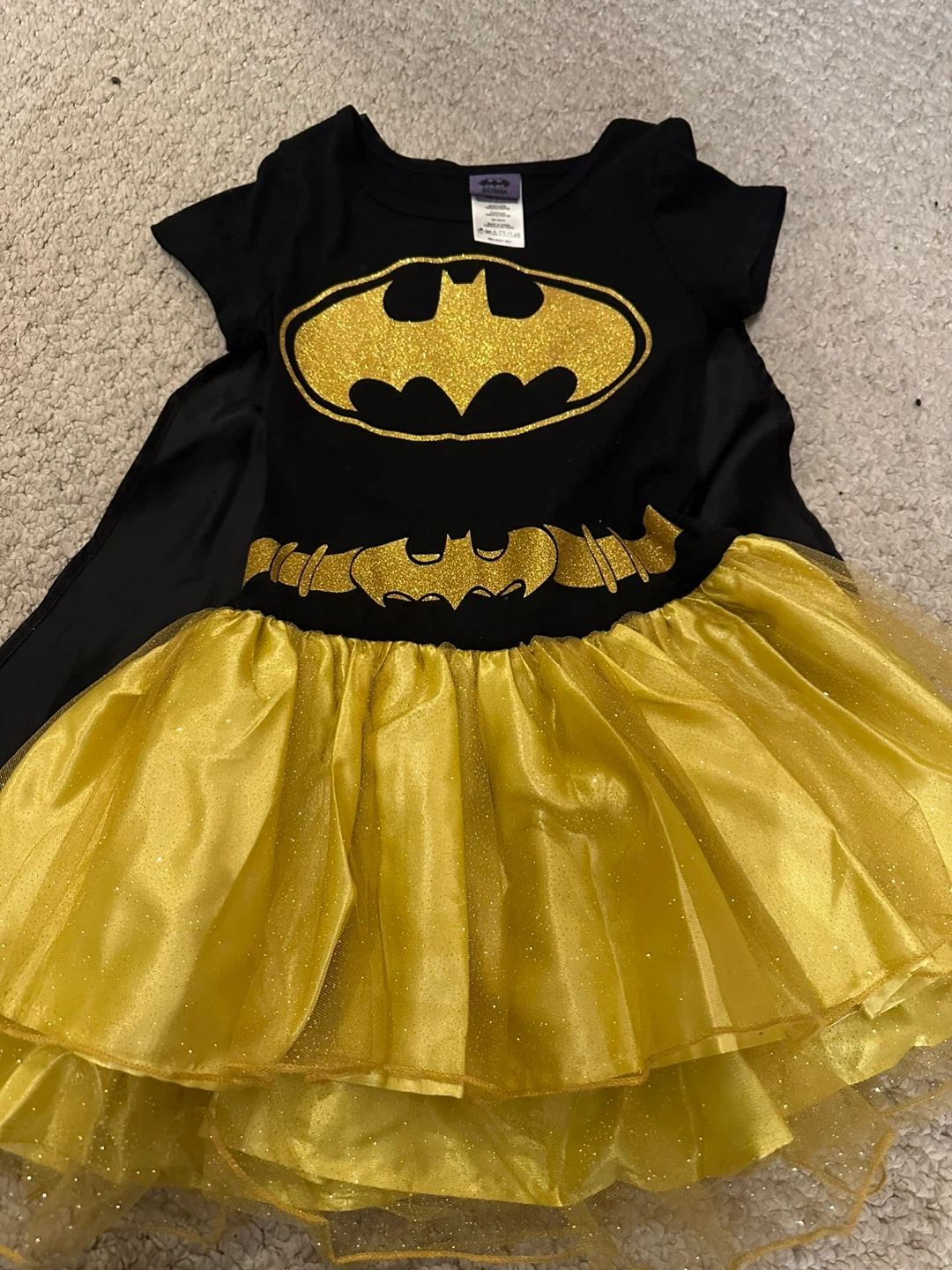 Get your little one ready for dress-up with this adorable Batman costume! It's a child's size medium (7/8) and features a black top with the iconic Batman logo in gold. The dress also has a fun yellow skirt and a black cape, perfect for imaginative play