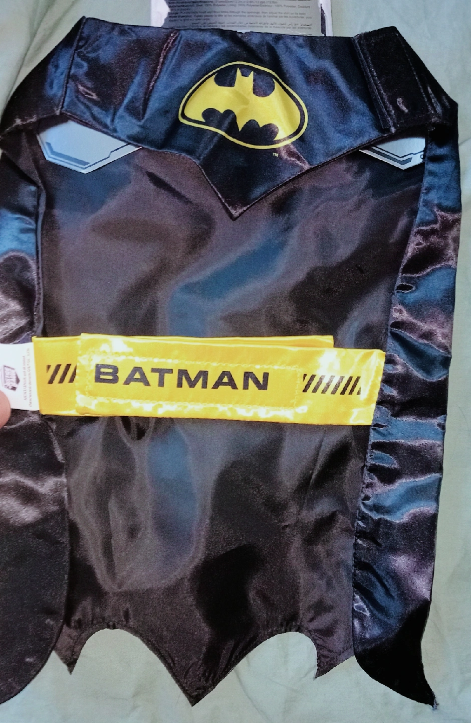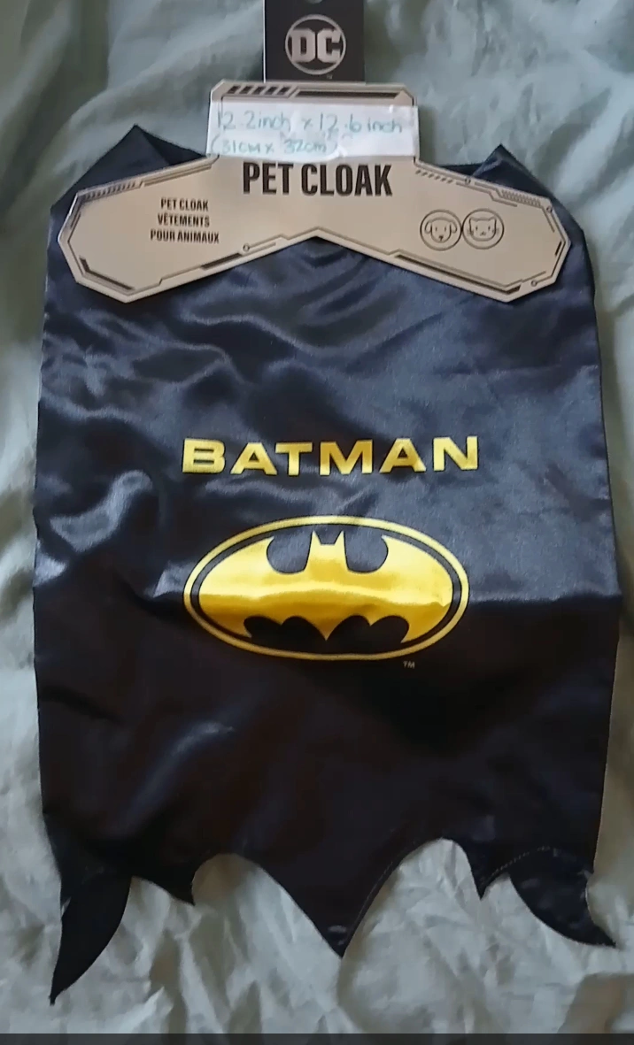 Check out this brand new Batman pet cloak! It's still in its original packaging and ready for your furry friend to become the Dark Knight. The size is 12.2 inch x 12.6 inch (31cm x 32cm).