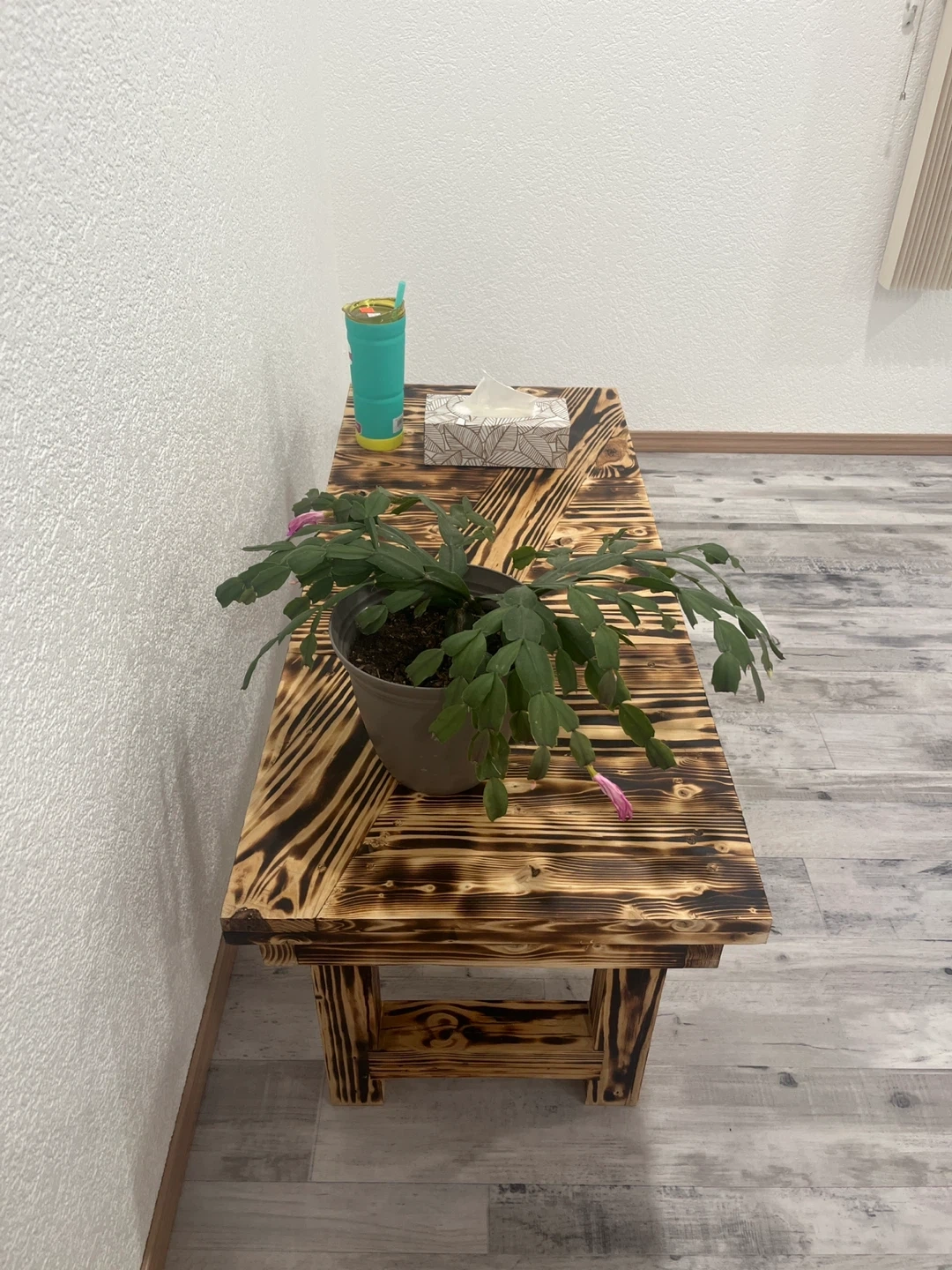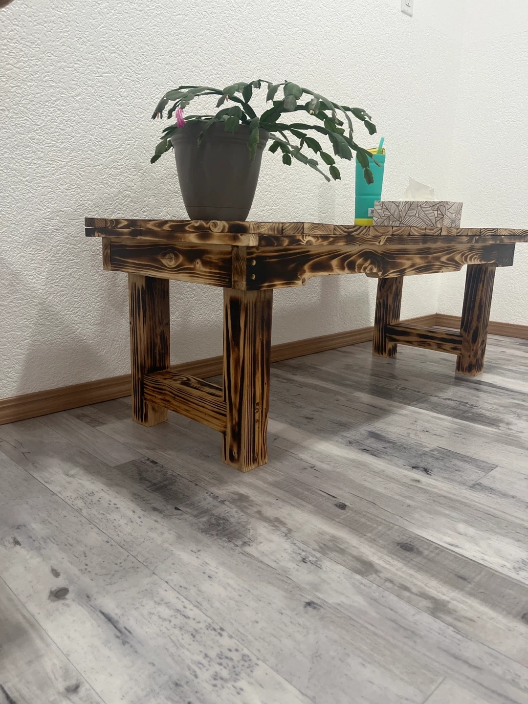 Rustic wood coffee table or bench with a burnt wood finish. It's constructed from solid wood with a distinctive grain pattern. This piece would work well as a low table or a casual bench.
