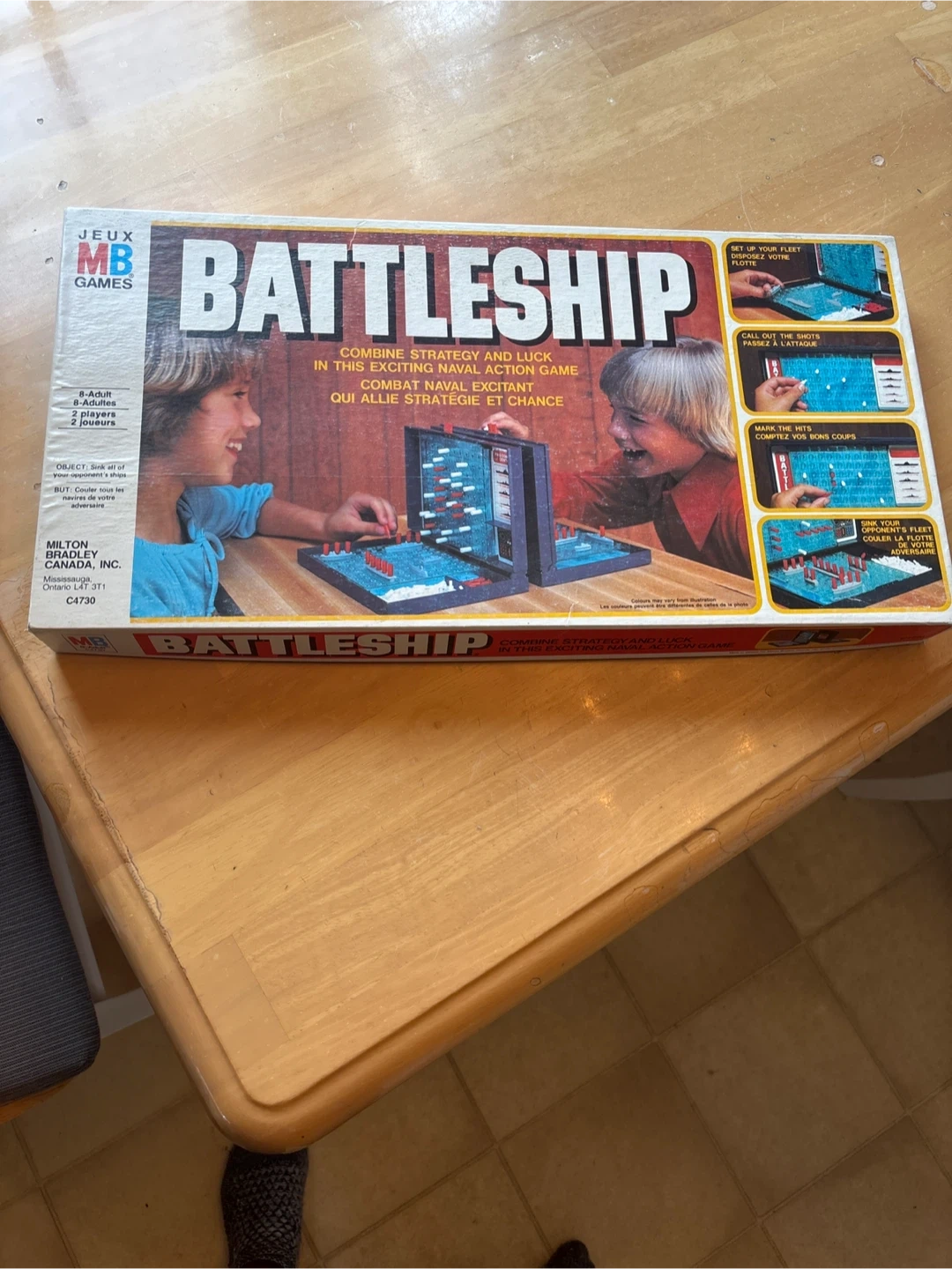 0Please call 604.929.3643. Battleship board game by MB Games! Combine strategy and luck to sink your opponent's fleet. Suitable for ages 8 and up, and perfect for 2 players. Box included!