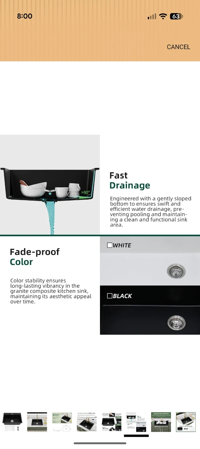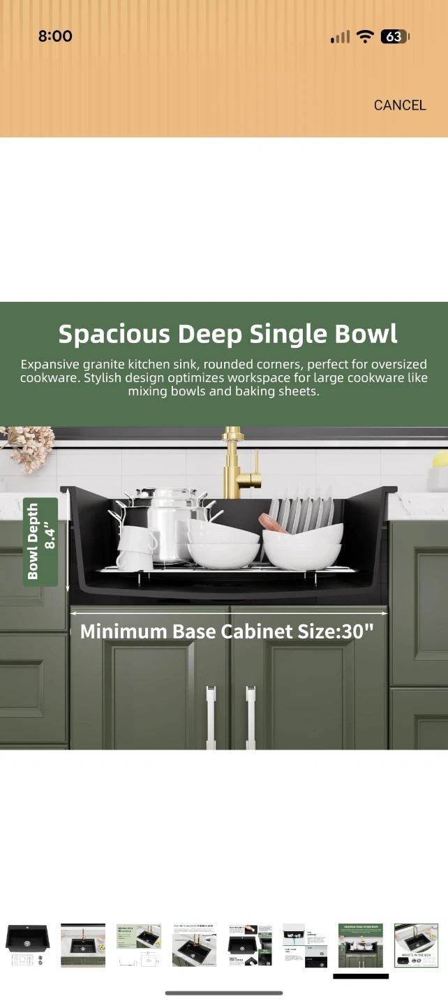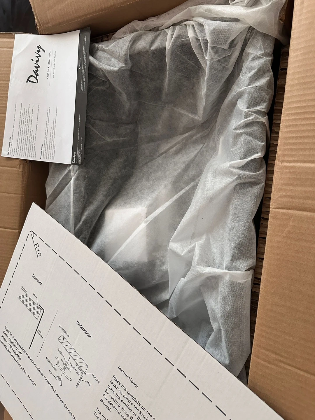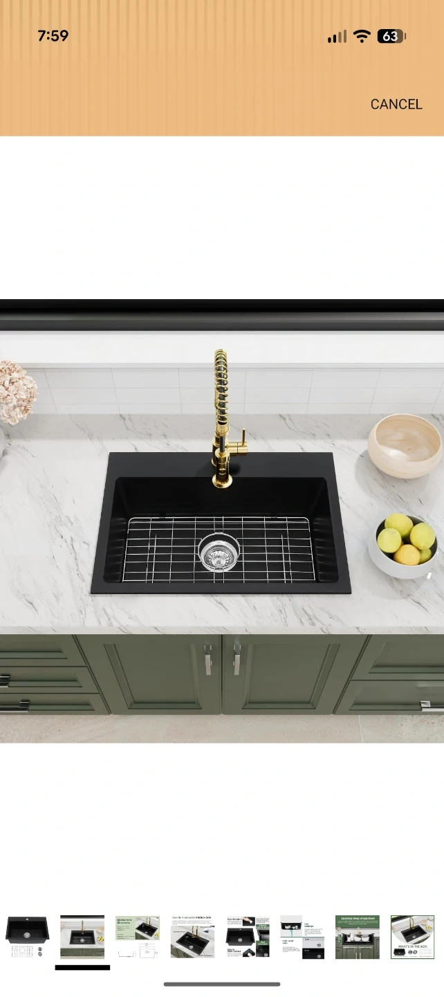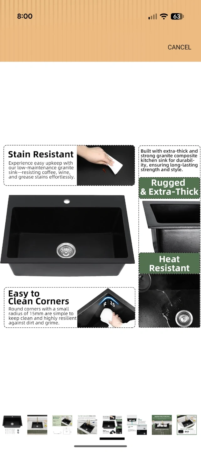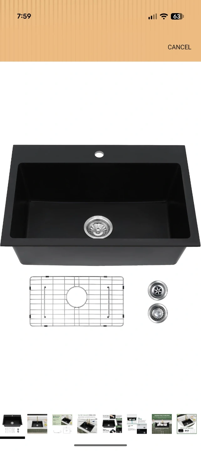 This is a Davivy granite composite kitchen sink. It's stain resistant, heat resistant up to 500°F, and naturally sound-deadening. The sink is 26.7" x 18.9" exterior dimensions and includes a bottom grid and drain assembly. This sink would be great for a busy kitchen needing easy cleanup and durability.