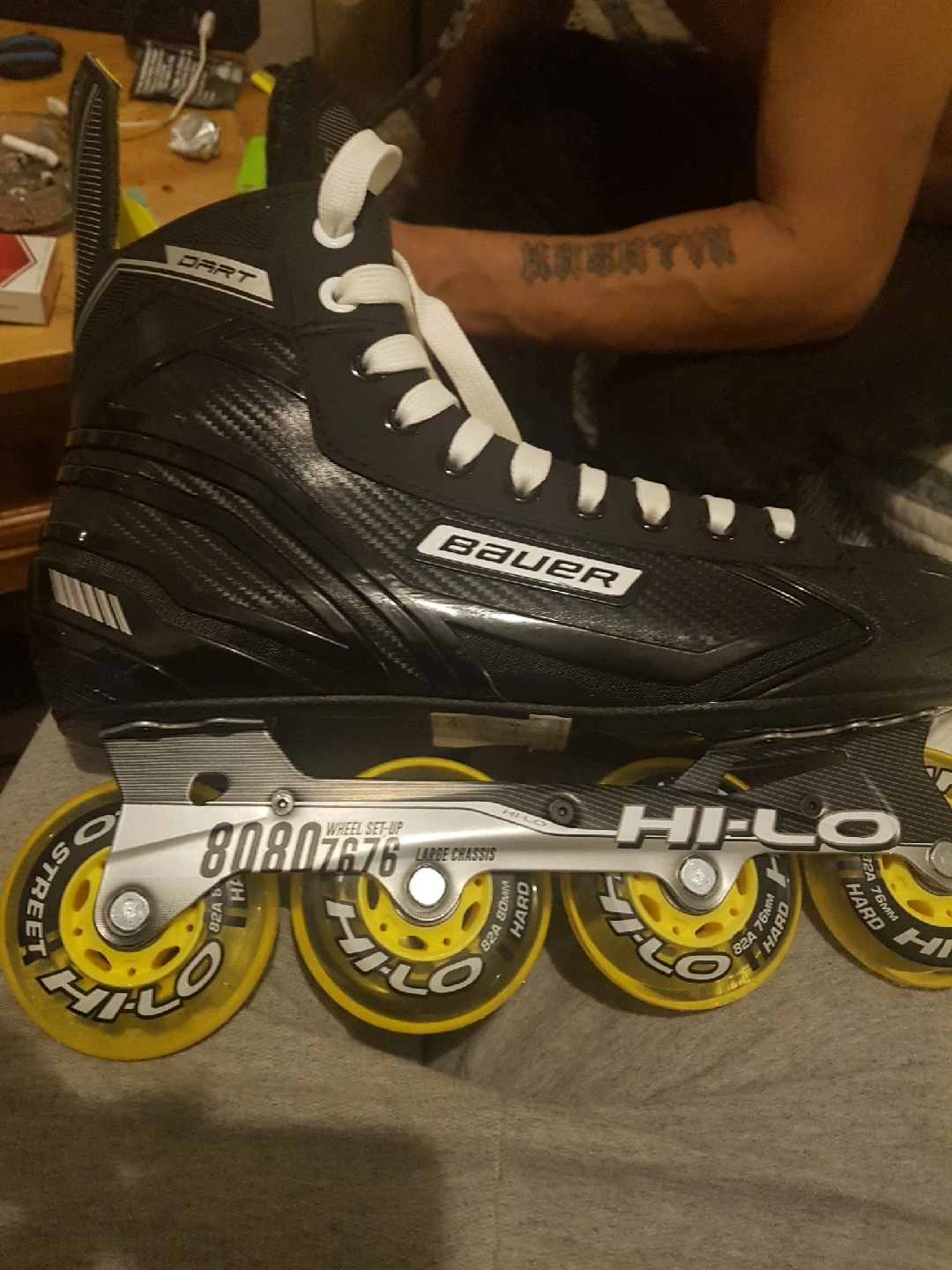 Selling a pair of Bauer Dart inline roller skates. They feature Hi-Lo wheels and a large chassis. The wheel setup includes 82A 80mm and 82A 76mm hard wheels. Great for street skating!