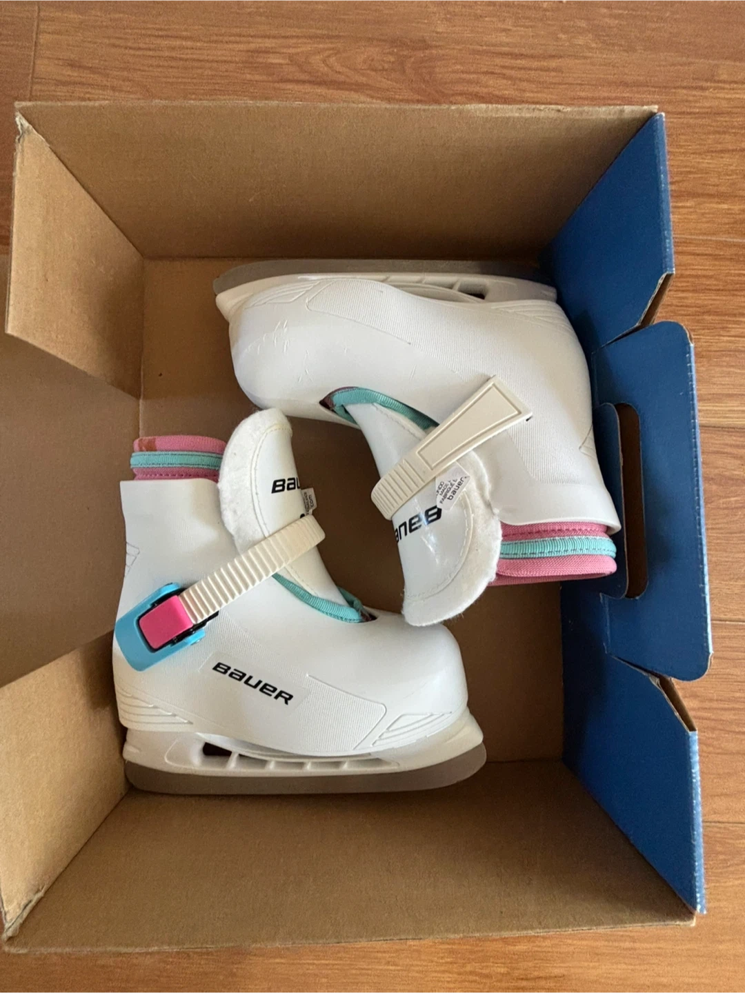 Selling a pair of Bauer Lil Angel girls' ice skates! They come in their original box. These skates are white with cute pink and blue accents. Perfect for a little one learning to skate!