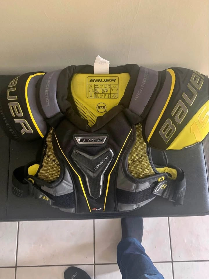 15Get ready to hit the ice with these Bauer Supreme S29 hockey shoulder pads, offering great protection and mobility for players. These pads are in good used condition and ready for action, providing reliable performance for your game. Brand: Bauer Model: Supreme S29 Size: Medium Looking to up your game without breaking the bank? These shoulder pads are your answer! Happy skating!