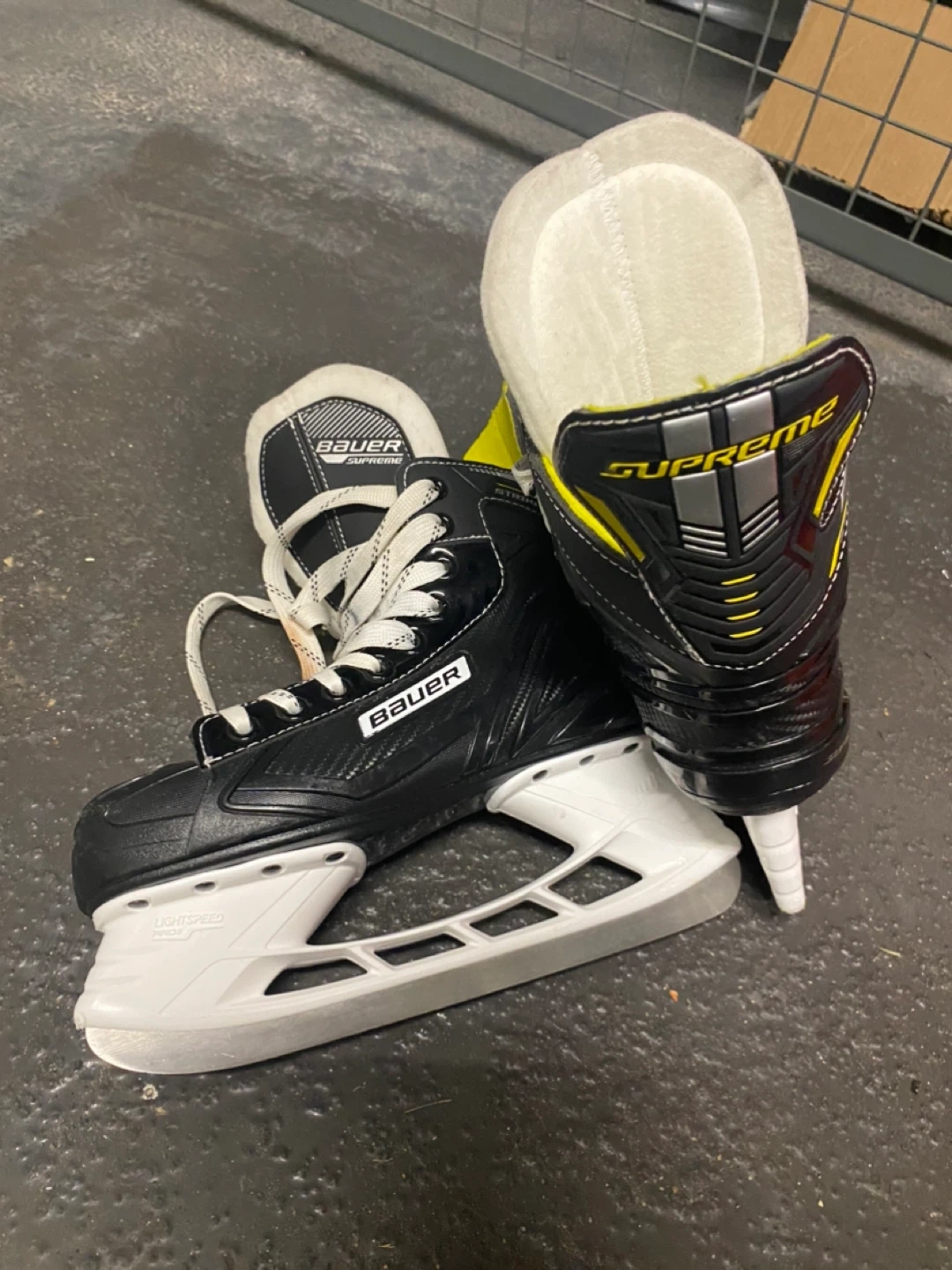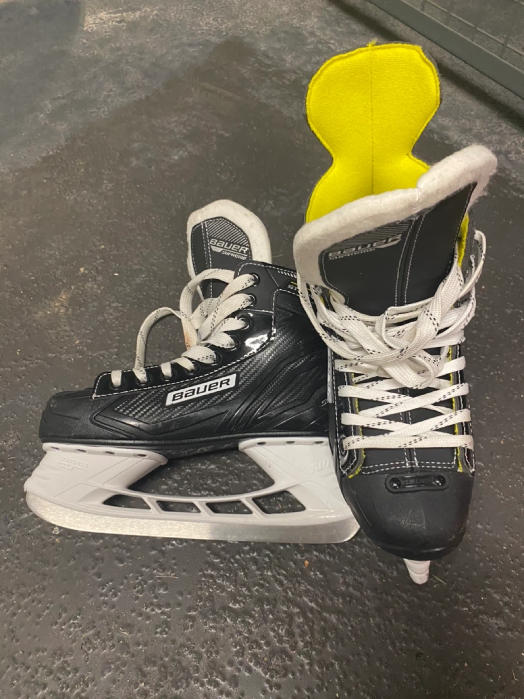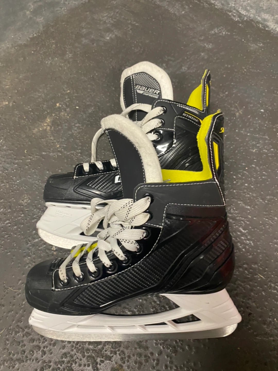 18Selling a pair of Bauer Supreme ice hockey skates. These are in good condition and ready for the rink! They feature a sleek black design with white and yellow accents. Perfect for anyone looking for quality skates.