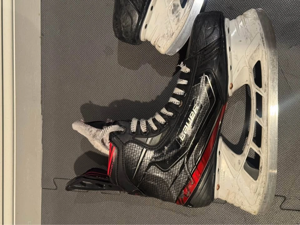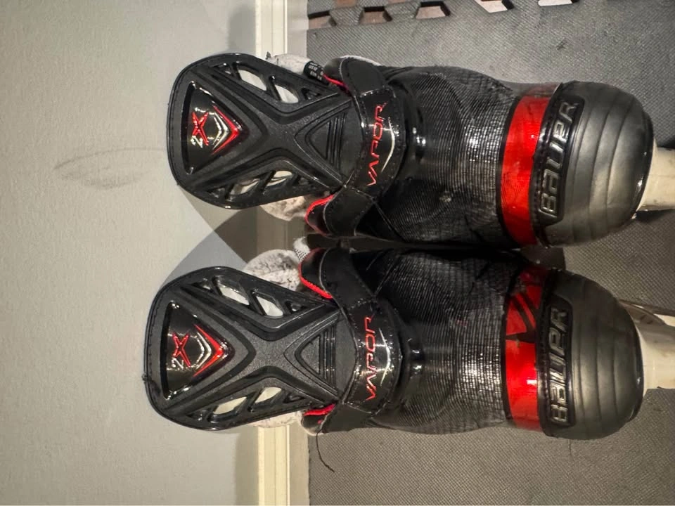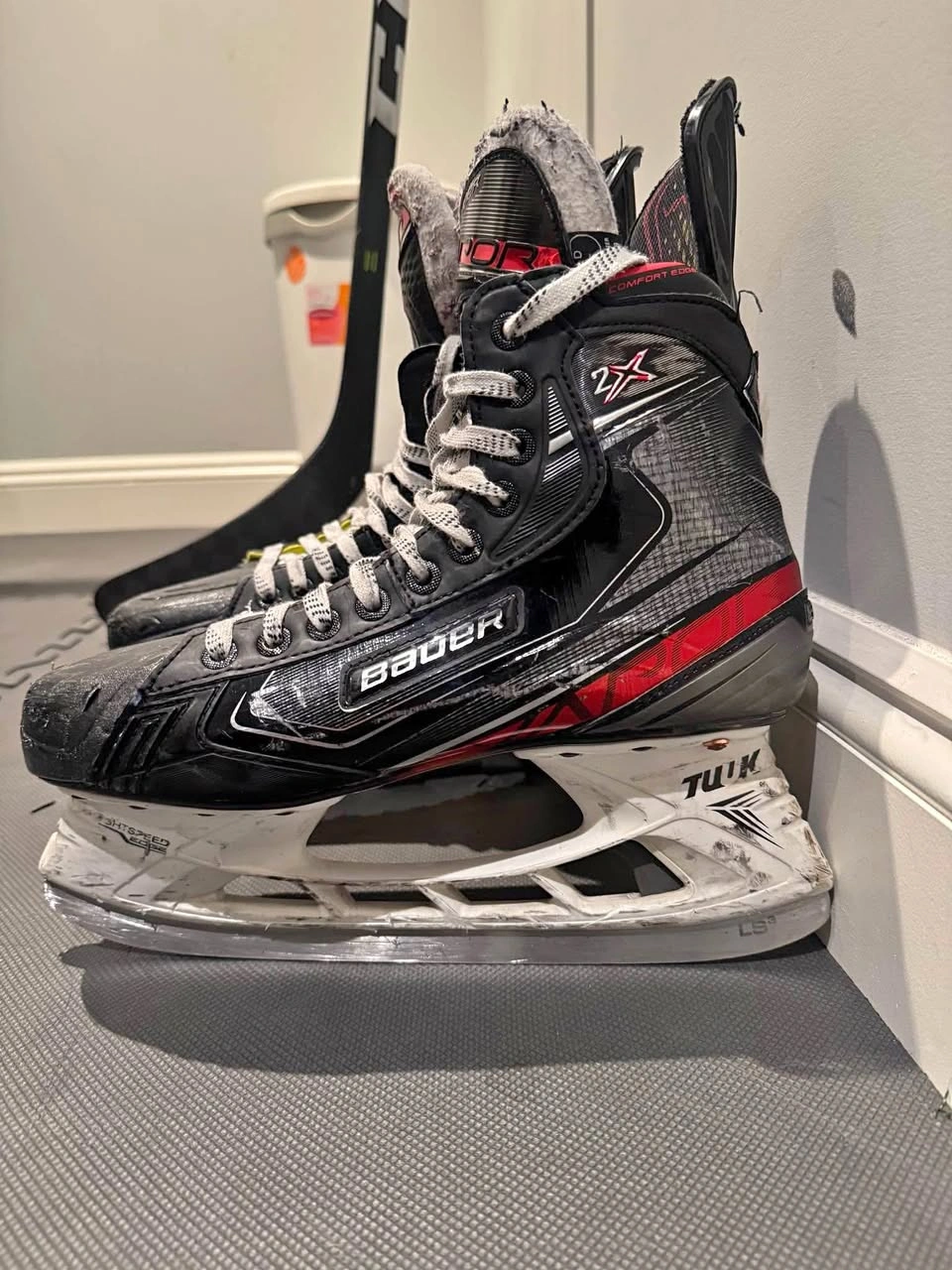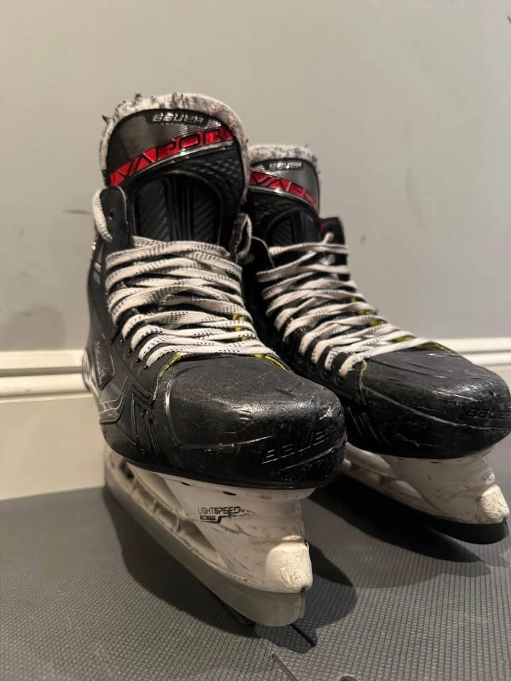 10Selling a pair of Bauer Vapor 2X senior ice hockey skates (Size 8.5D). Condition: • Used, but in good condition. The boot structure is solid with no separation or cracks; toe box and side show normal scuffing from use. • Interior padding and liner are very clean and comfortable, still locking your foot in well. • Tongues show some fuzzing/wear but no major damage. • Blades and holders (Tuuk Lightspeed Edge + LS steel) still have plenty of life left. Details: • Model: Bauer Vapor 2X (senior) • Size: 8.5D (regular width) • Comes as shown in photos. Blade sharpened before listing and ready for ice. Why they're great: The Vapor 2X is Bauer's high-end performance model featuring a low-profile composite boot, Aero Foam memory ankle padding and the Tuuk Lightspeed EDGE holder system. For someone wanting elite features without paying full retail this is a great value.