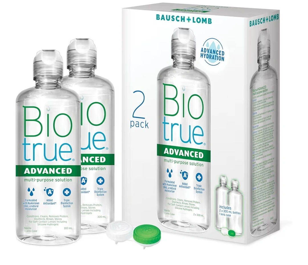 26Selling a 2-pack of Bausch + Lomb Biotrue Advanced multi-purpose solution! This solution is formulated with hyaluronan for advanced hydration and includes a lens case. It cleans, disinfects, rinses, and stores soft contact lenses, including silicone hydrogels. Each bottle contains 300 mL.
