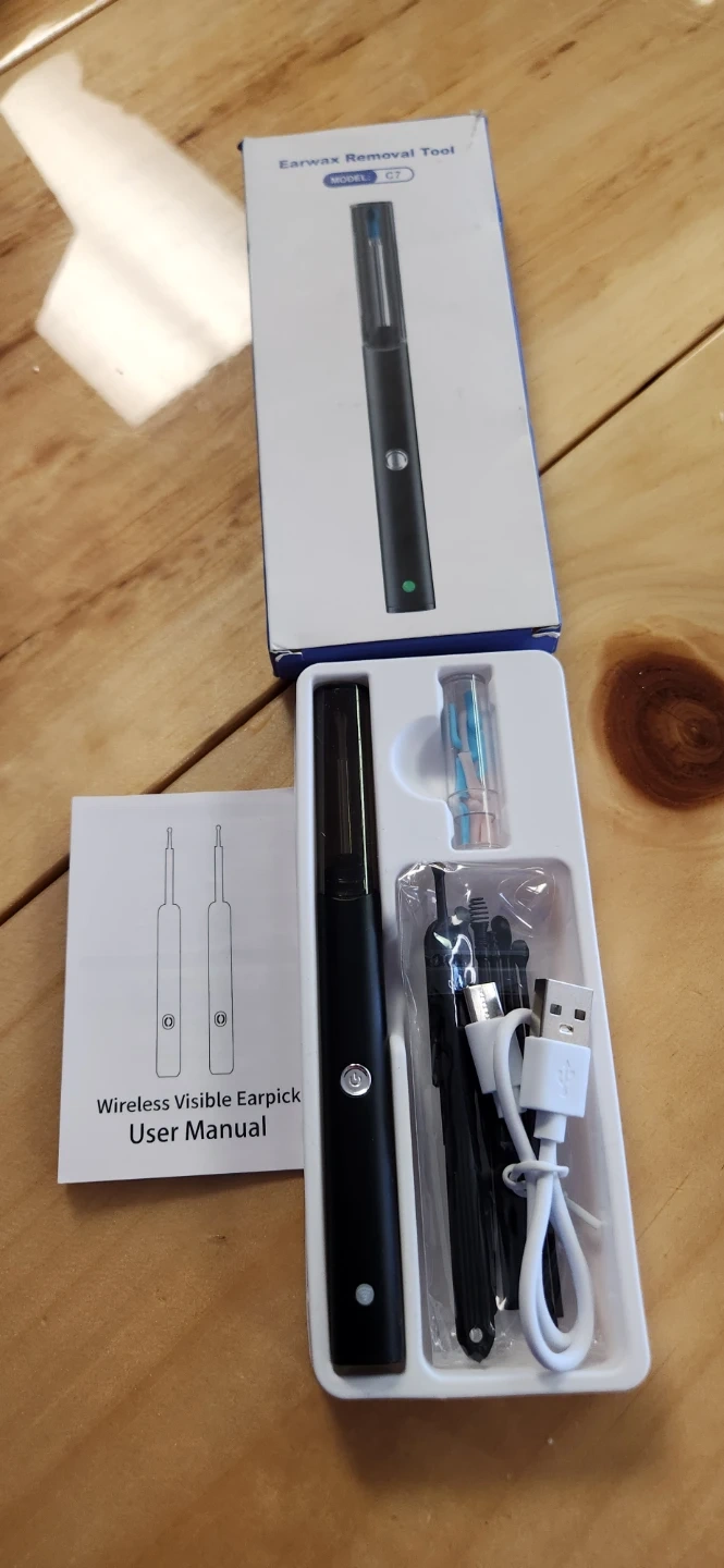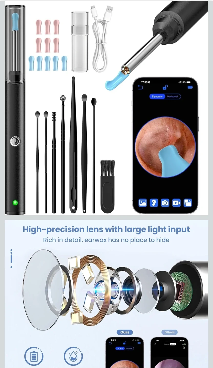 This black earwax removal tool features a high-precision lens with large light input for clear visibility. It's wireless and comes with multiple ear picks and a USB charging cable. This tool is useful for cleaning ears, nose, skin, and even for checking pets or hair.