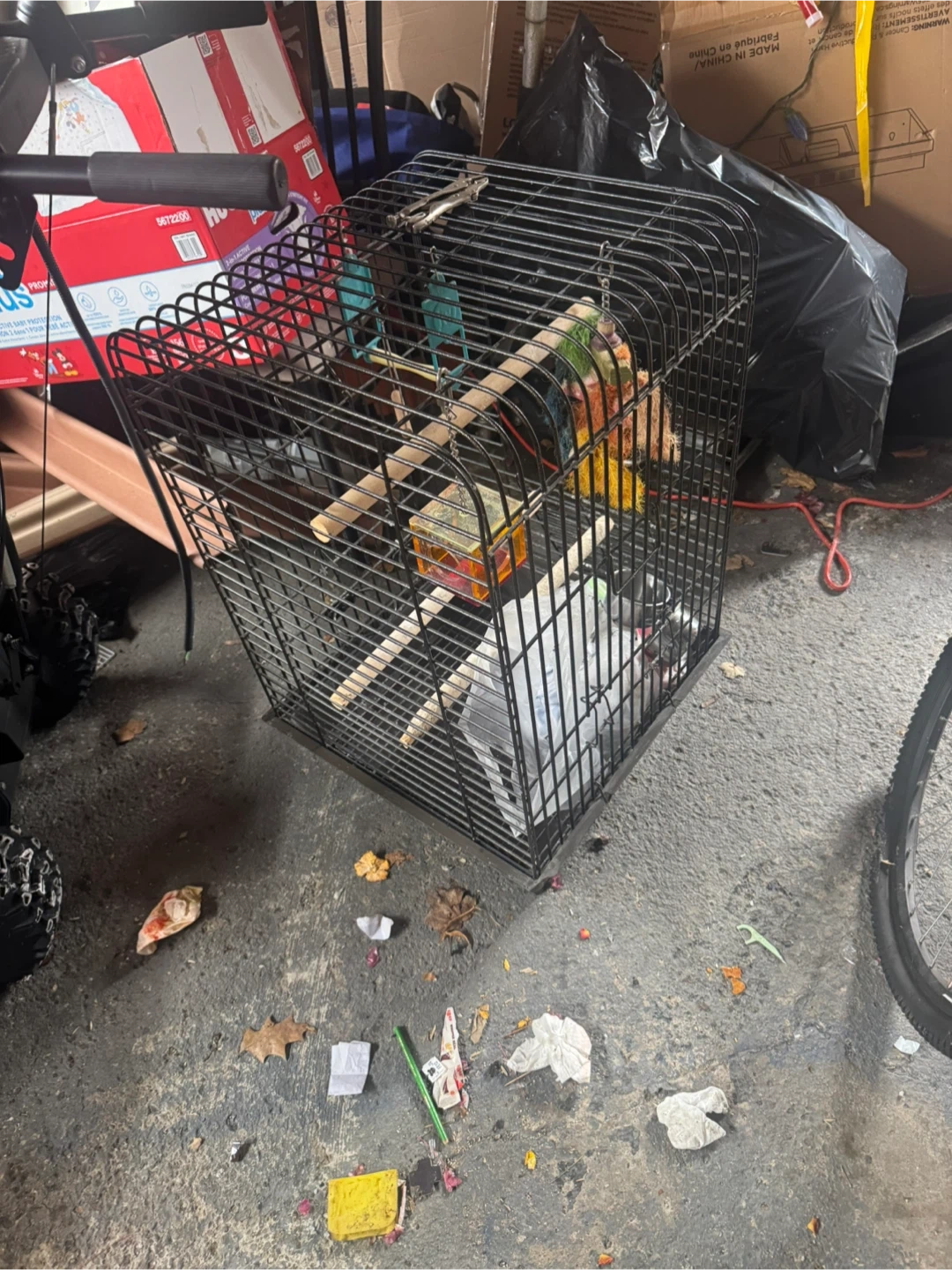 This is a black wire bird cage with multiple perches and colourful toys inside. It includes a food or water dish. It's a good size for small to medium birds. This cage is ready for a new feathered friend!