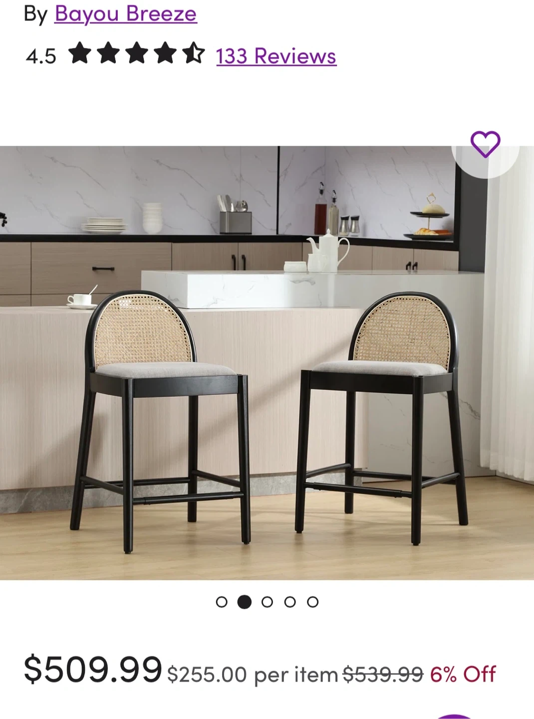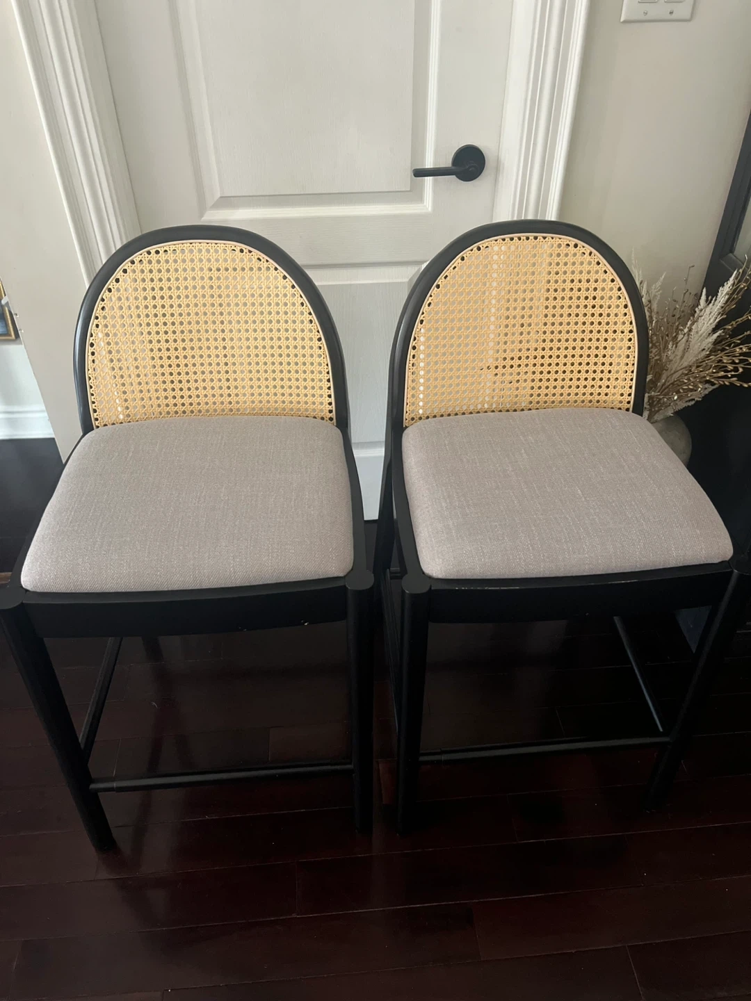 Selling a set of two Bayou Breeze bar stools. They feature a black frame, a woven rattan back, and a grey upholstered seat. Stools are in excellent condition with only minor surface wear on the paint, as shown in photos. See last photo for size dimensions. Pick up only near main intersection Caledonia and Eglinton.
