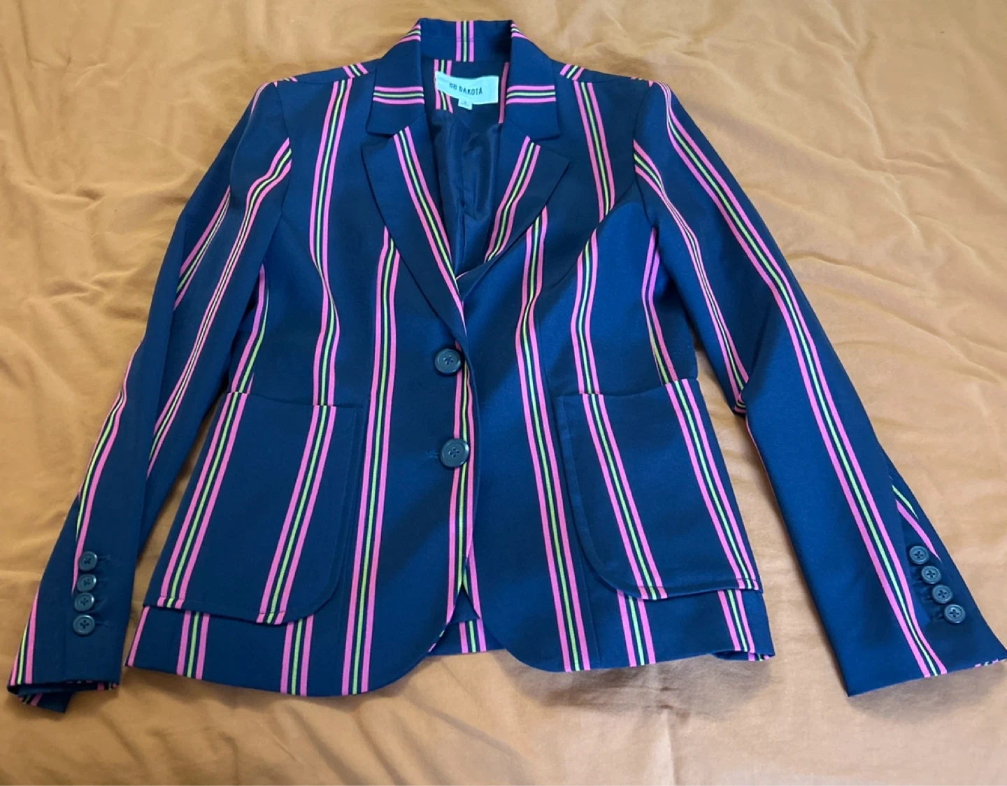 Selling a BB Dakota blazer in size small. It features a stylish striped pattern with pink and yellow accents on a navy blue background. The shell is 96% polyester and 4% elastane, while the lining is 100% polyester.