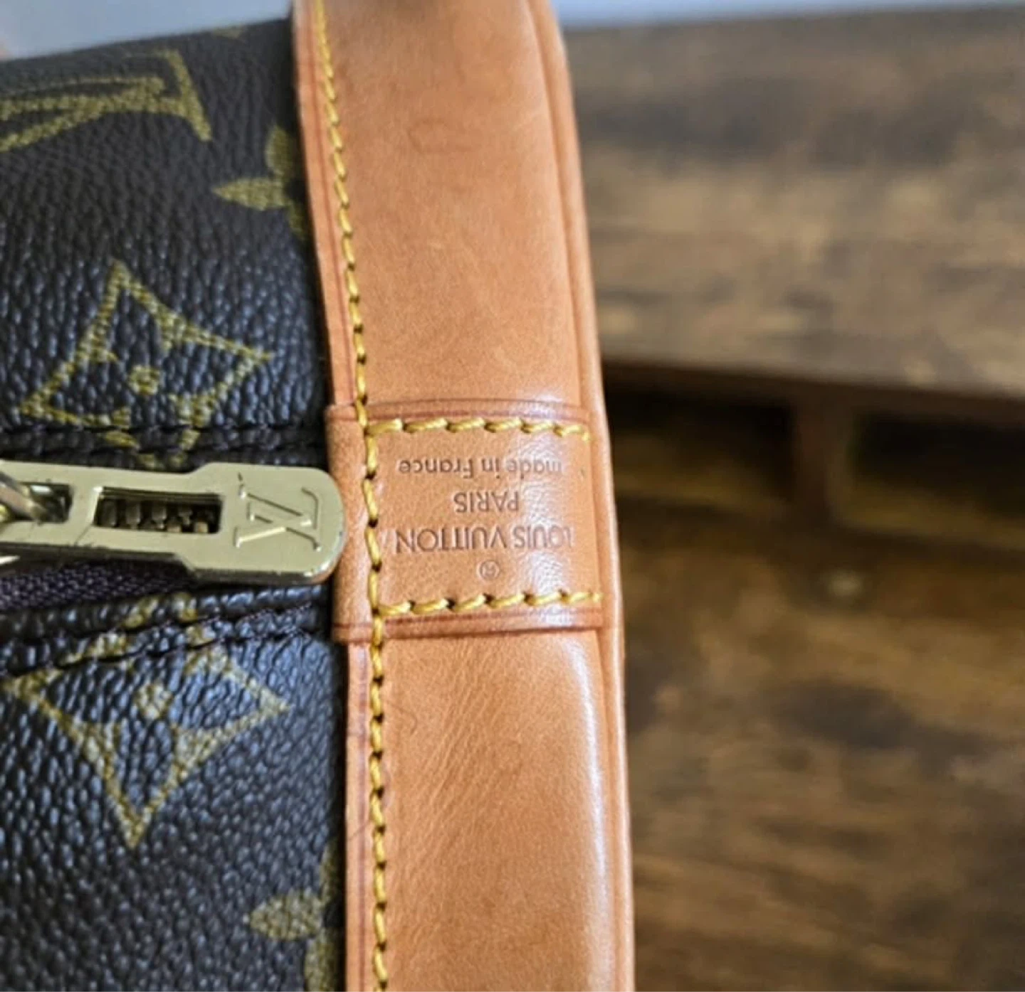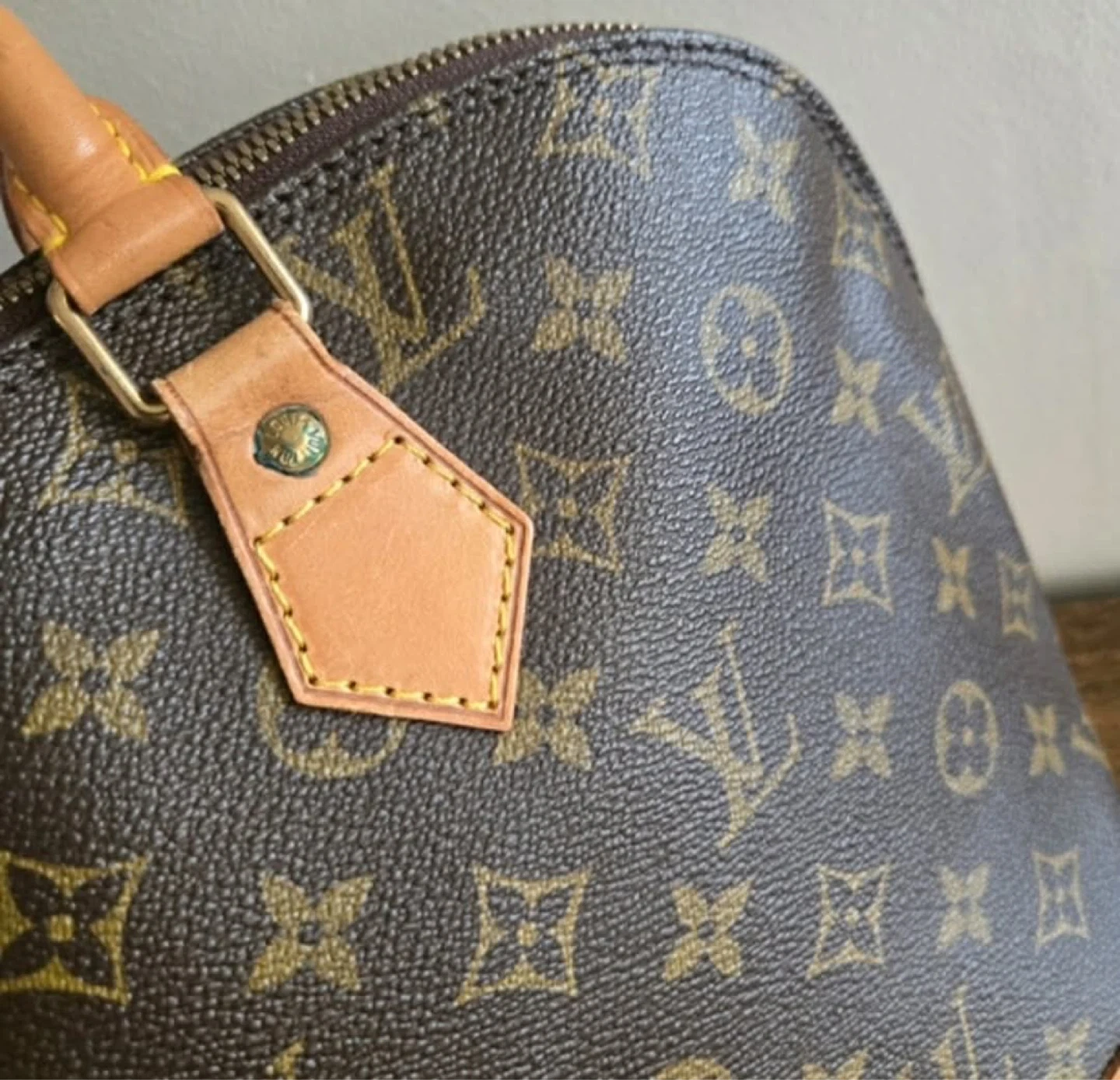 Classic Louis Vuitton Alma handbag in signature monogram canvas. This bag features rolled leather handles and a zip-around closure. Interior includes a small pocket. Date code VI0943.