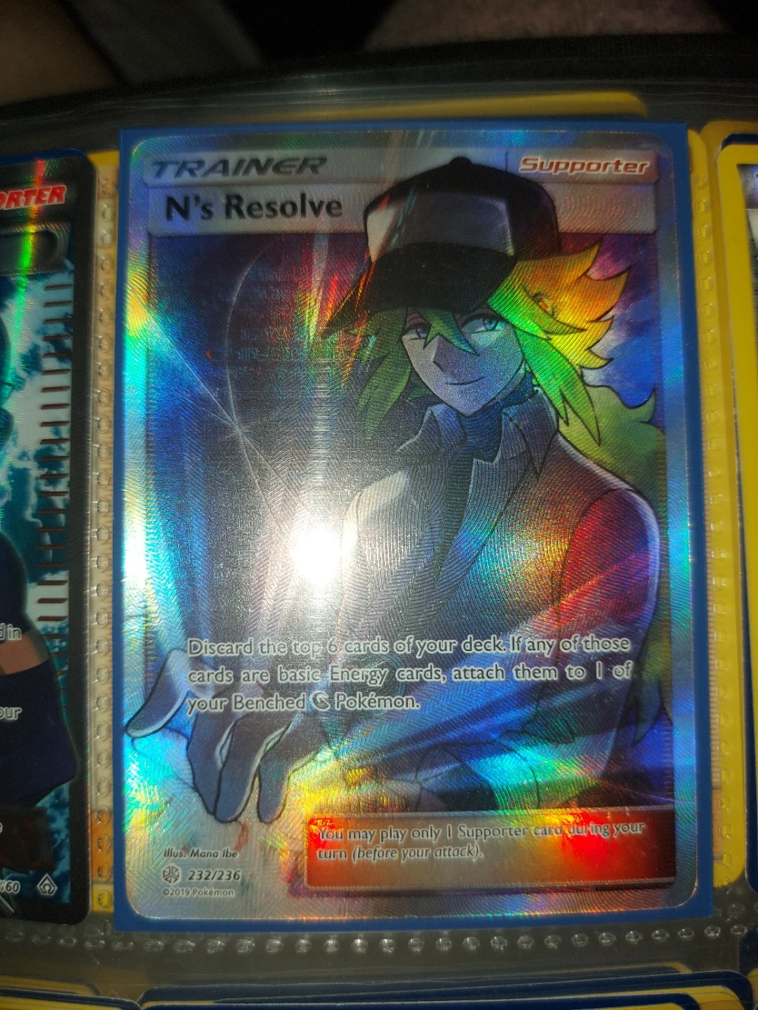 This is a Pokemon N's Resolve Trainer card, featuring full art. It's part of the 232/236 set from 2019. The card has a holographic finish and is in good condition.