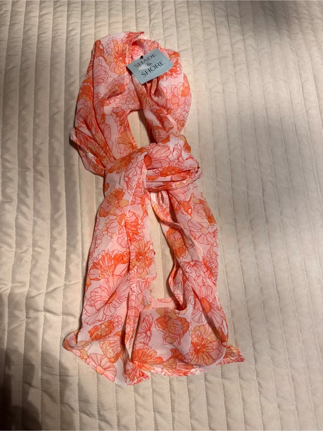 This is a new Shade & Shore women's scarf with a floral print. It's a size M and made in Vietnam. It's perfect for adding a pop of colour to any outfit!